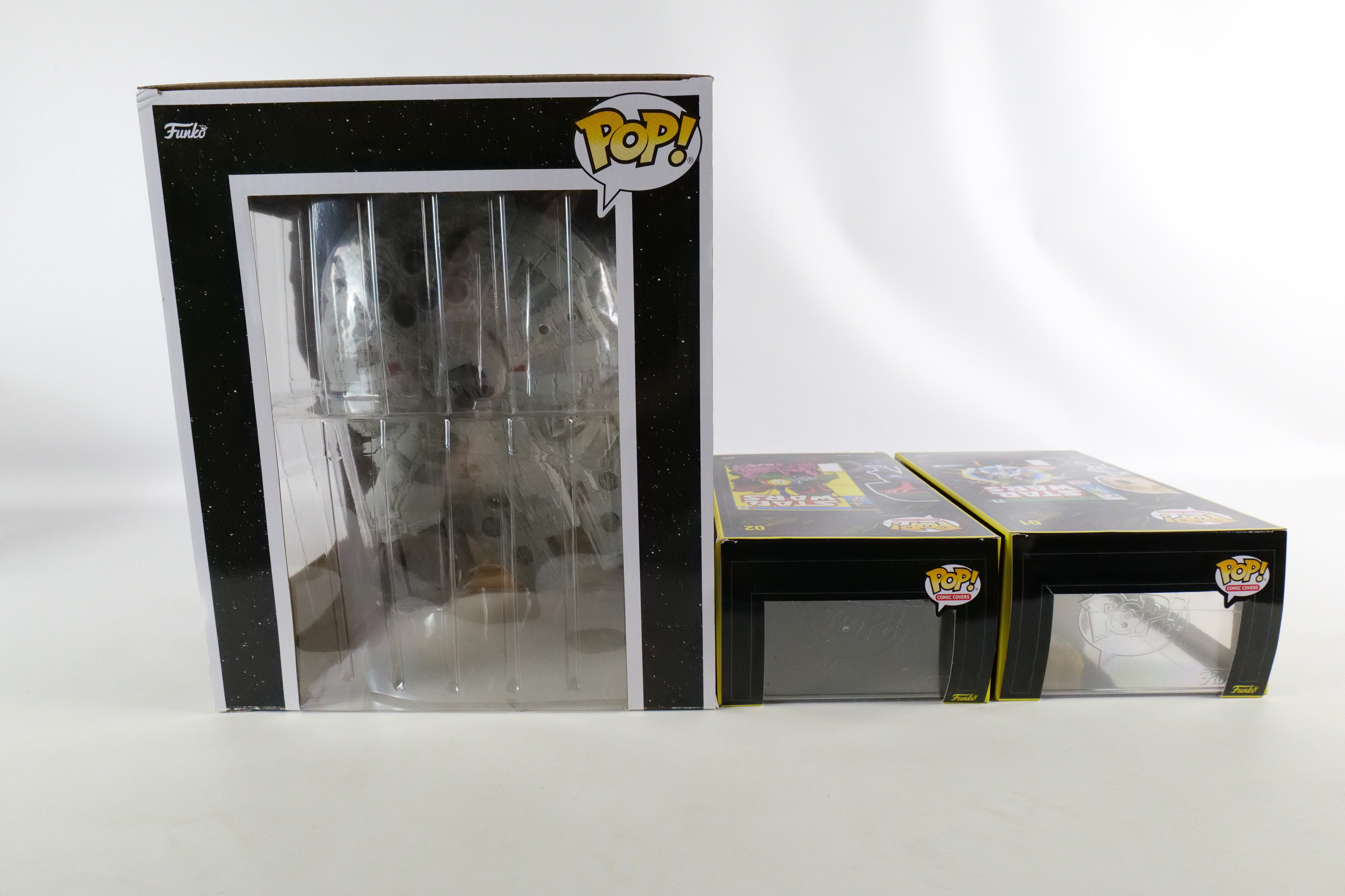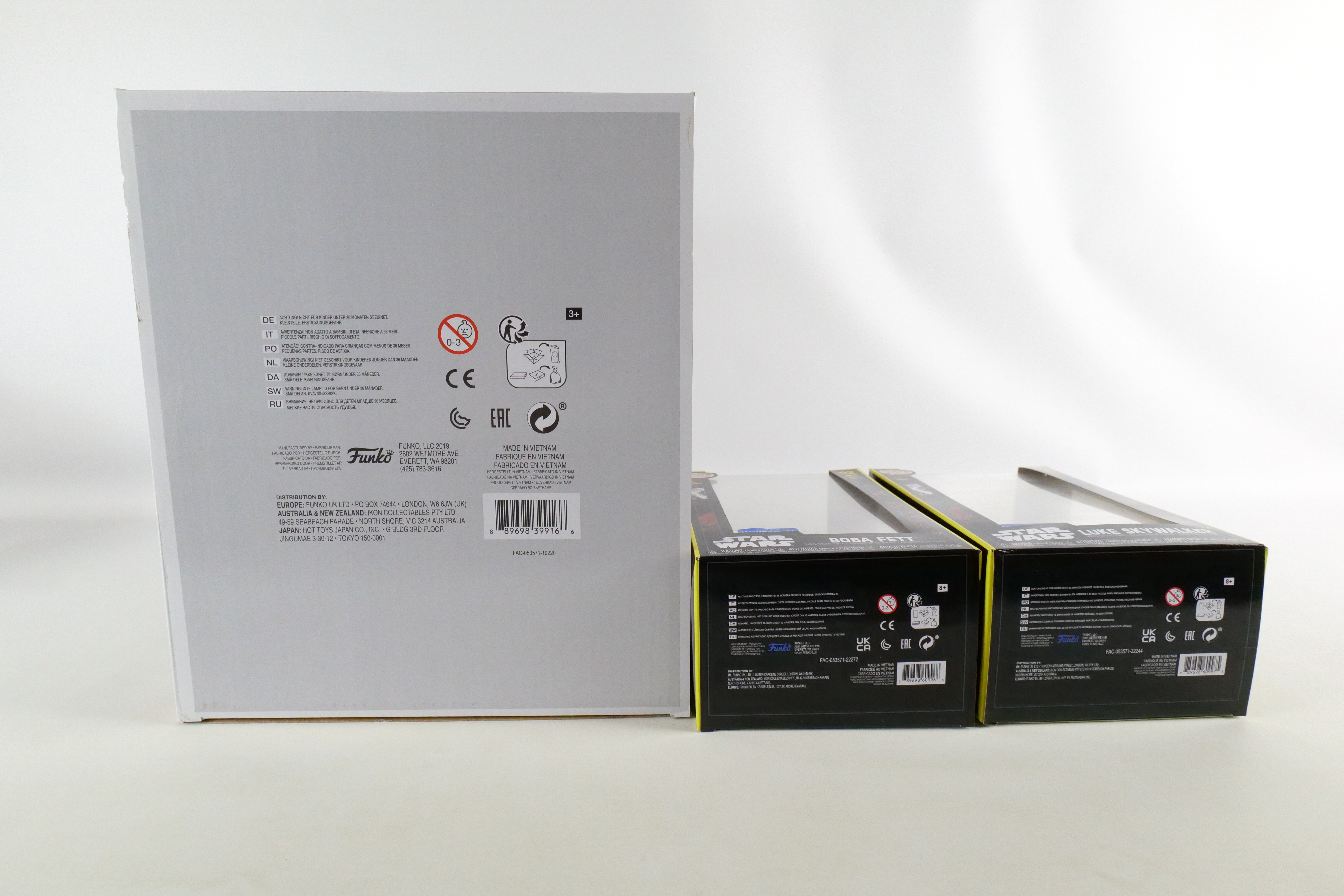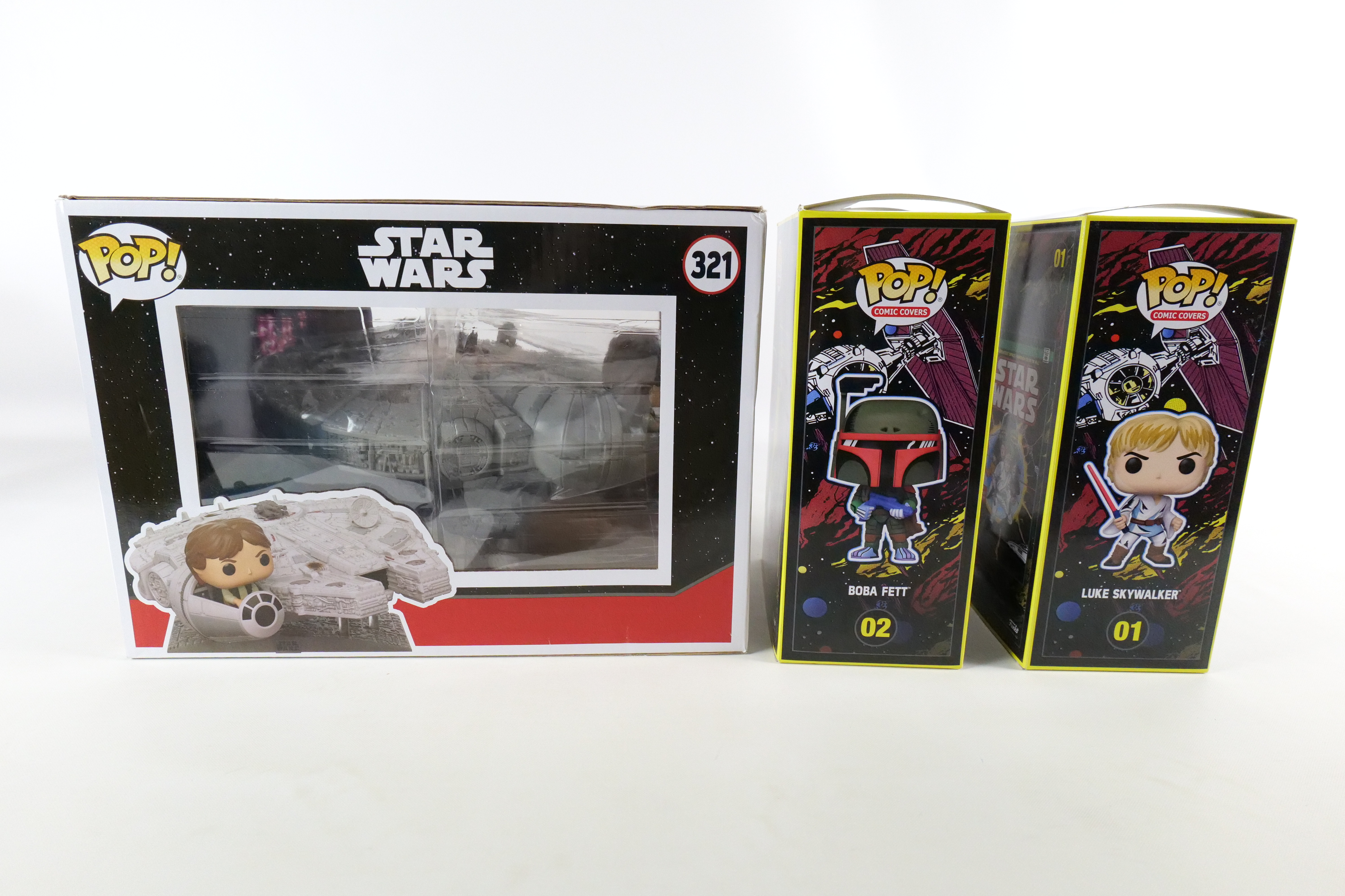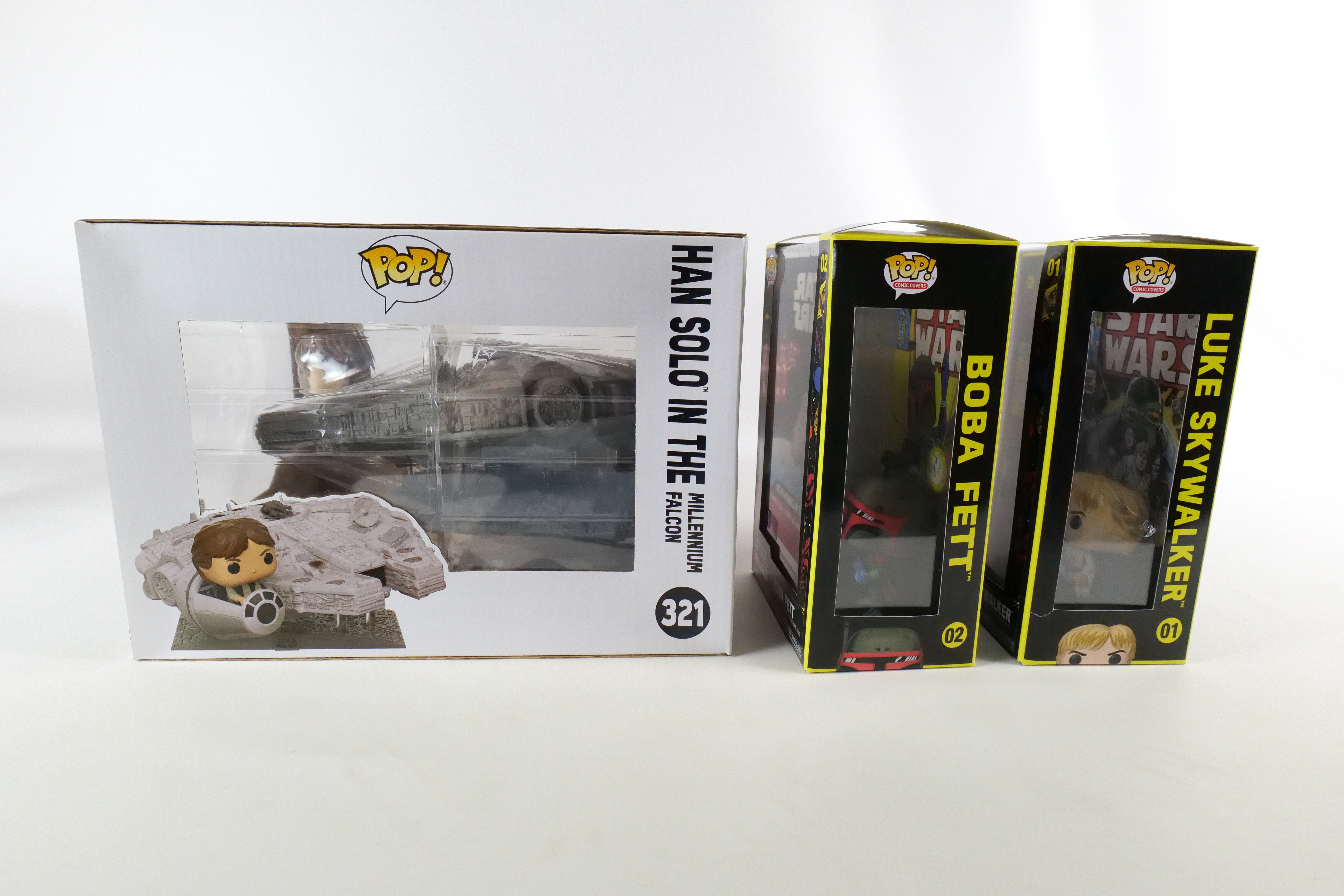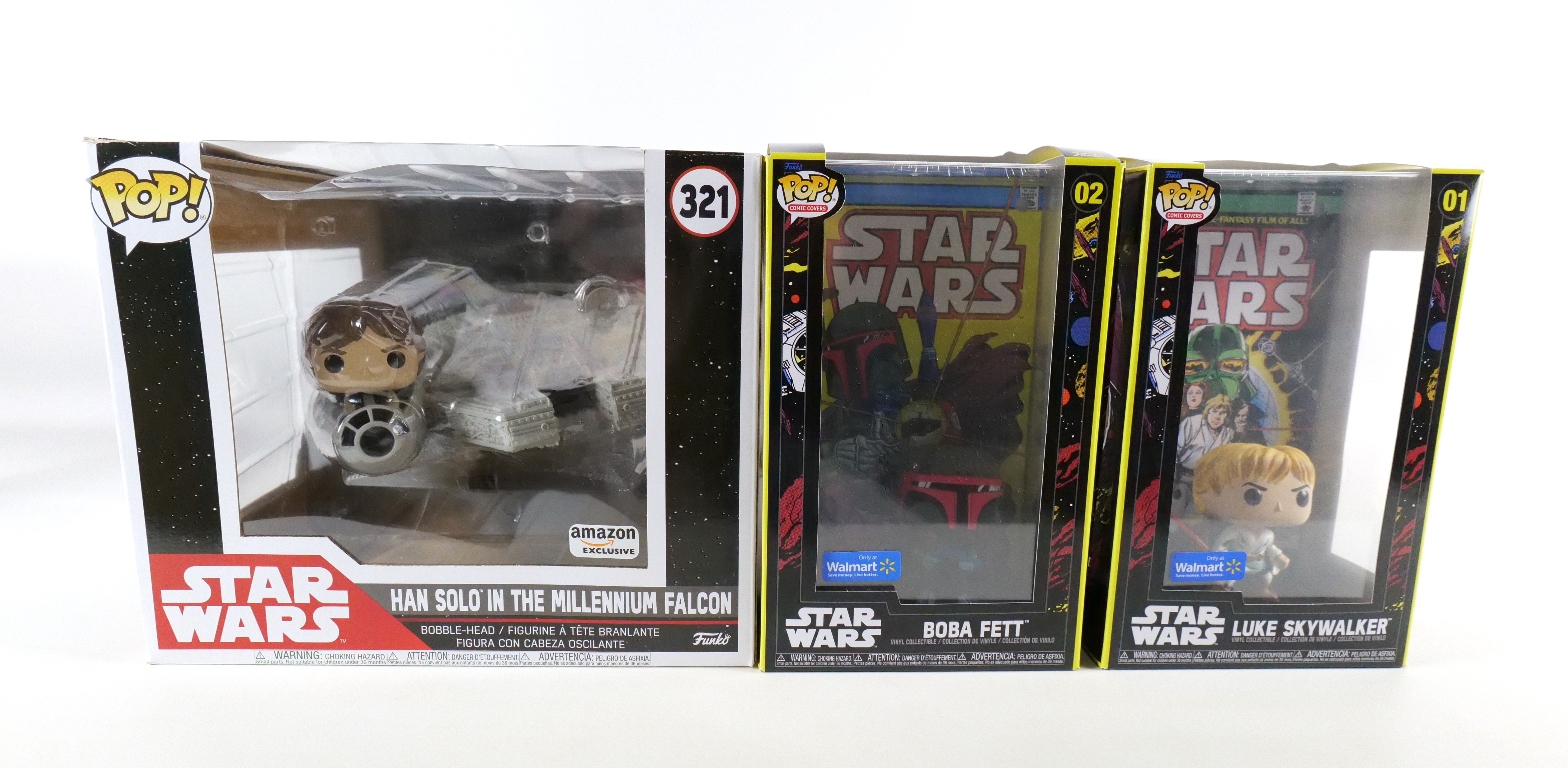 Lot of 3 Funko Star Wars Collectibles. Including Comic Covers: Luke Skywalker #01 and Boba Fett #02, and Han Solo in the Millennium Falcon #321 Amazon Exclusive. All pops are in new condition and come in the original boxes. The boxes may have slight wear/slight creasing/dings from storage. All invoices must be paid within 24 hours of the sale. We offer multiple shipping options please read the shipping terms to understand your options. We also offer Pick-Ups Friday, Saturday, and Monday immediately following the sale. BY APPOINTMENT ONLY.
