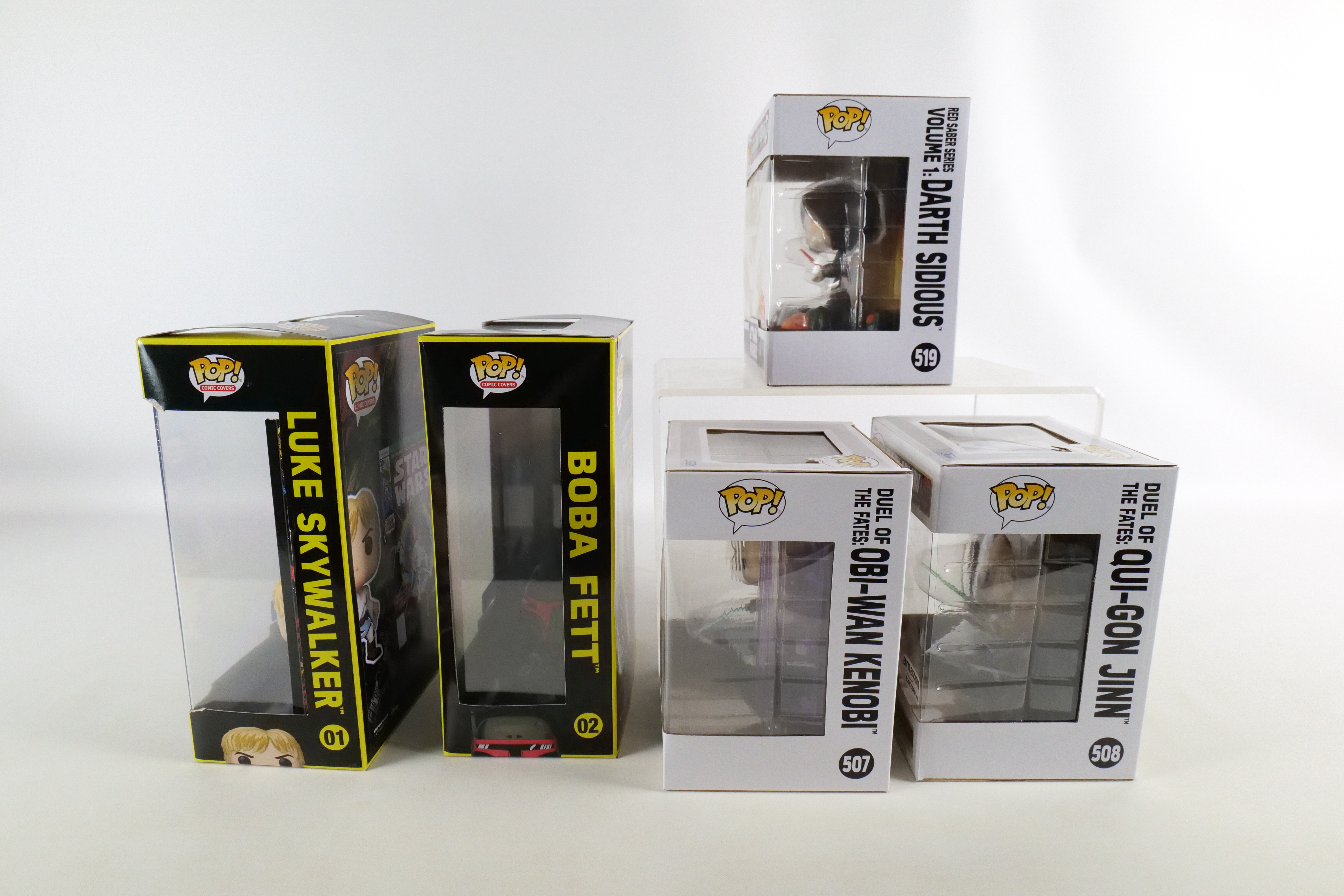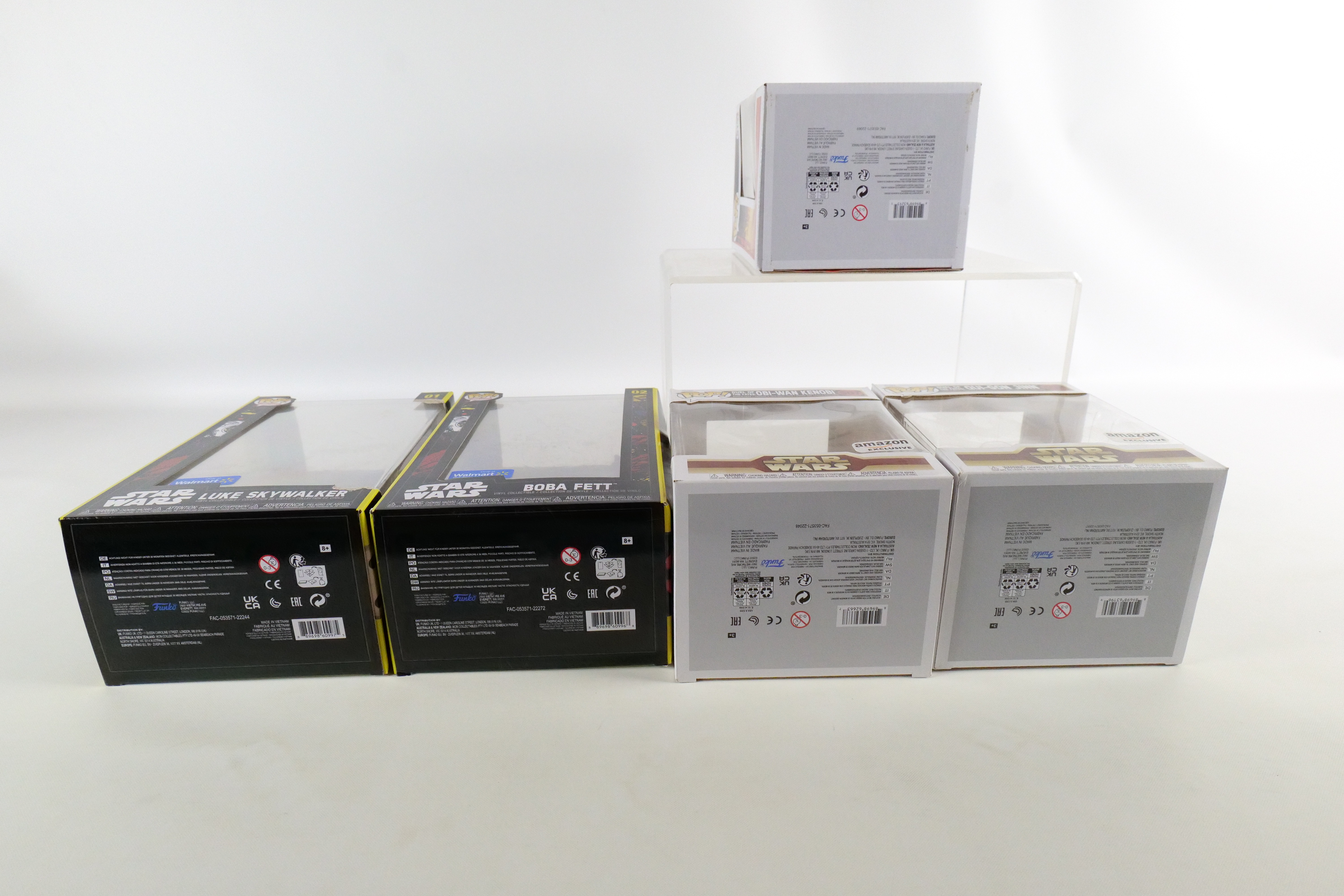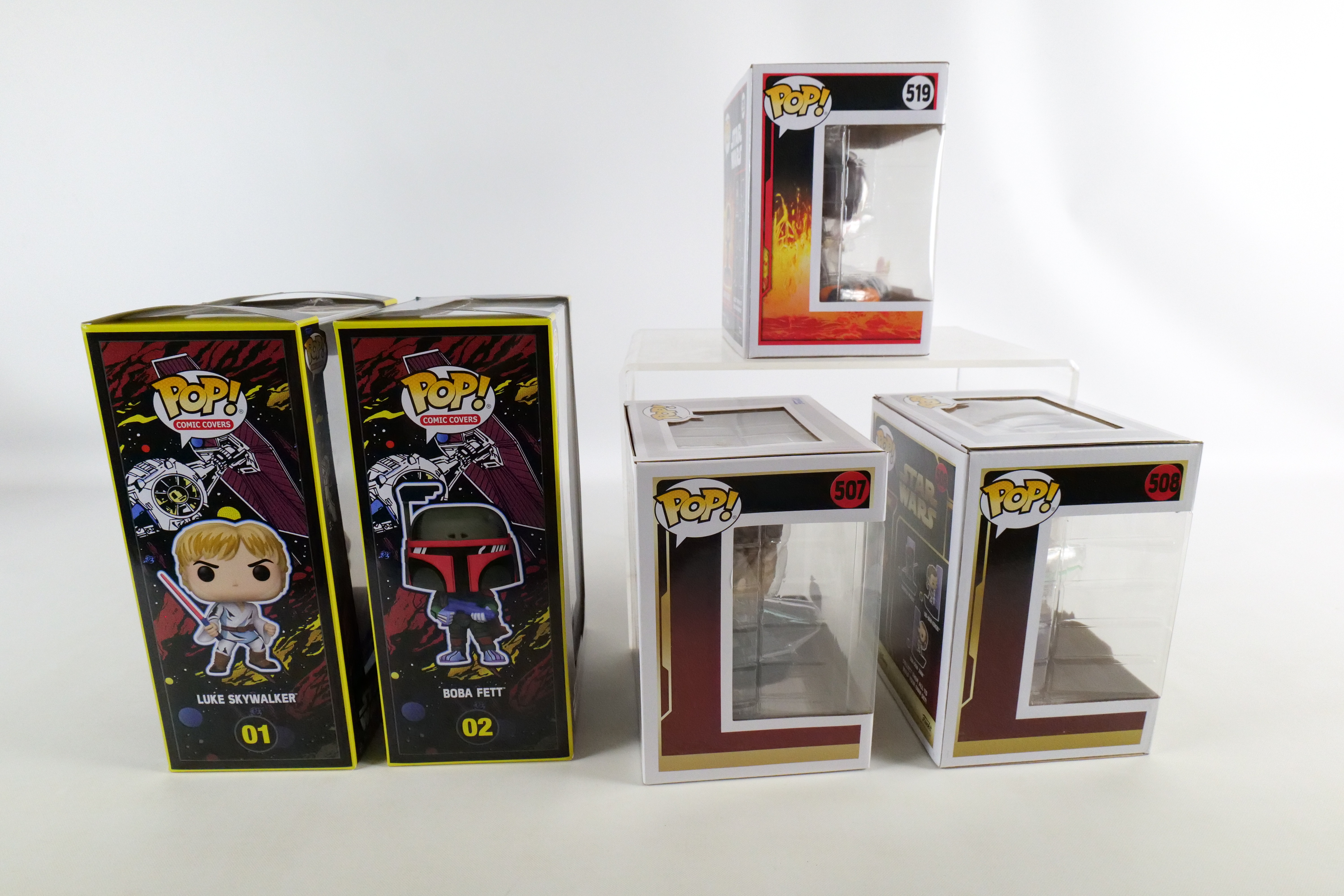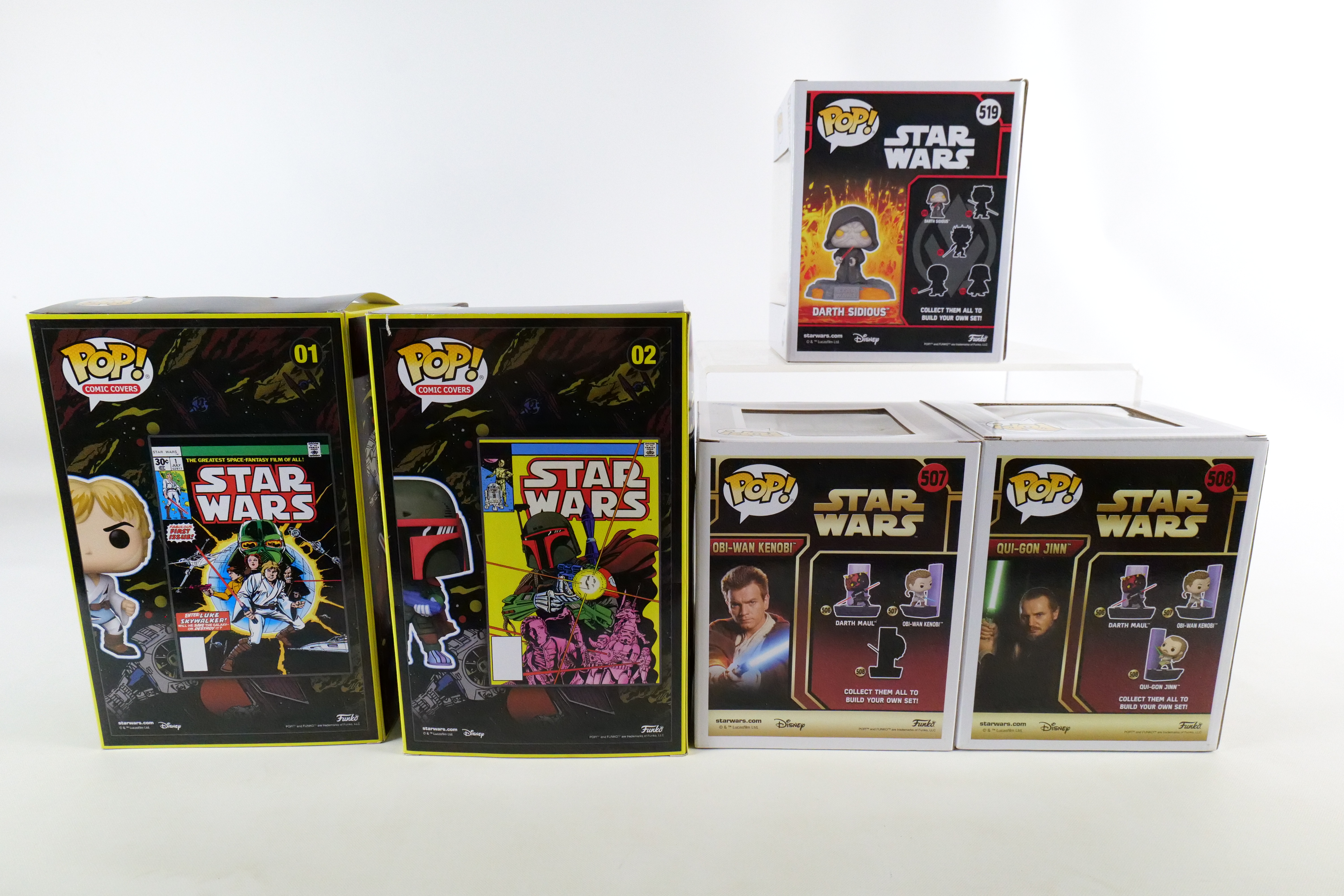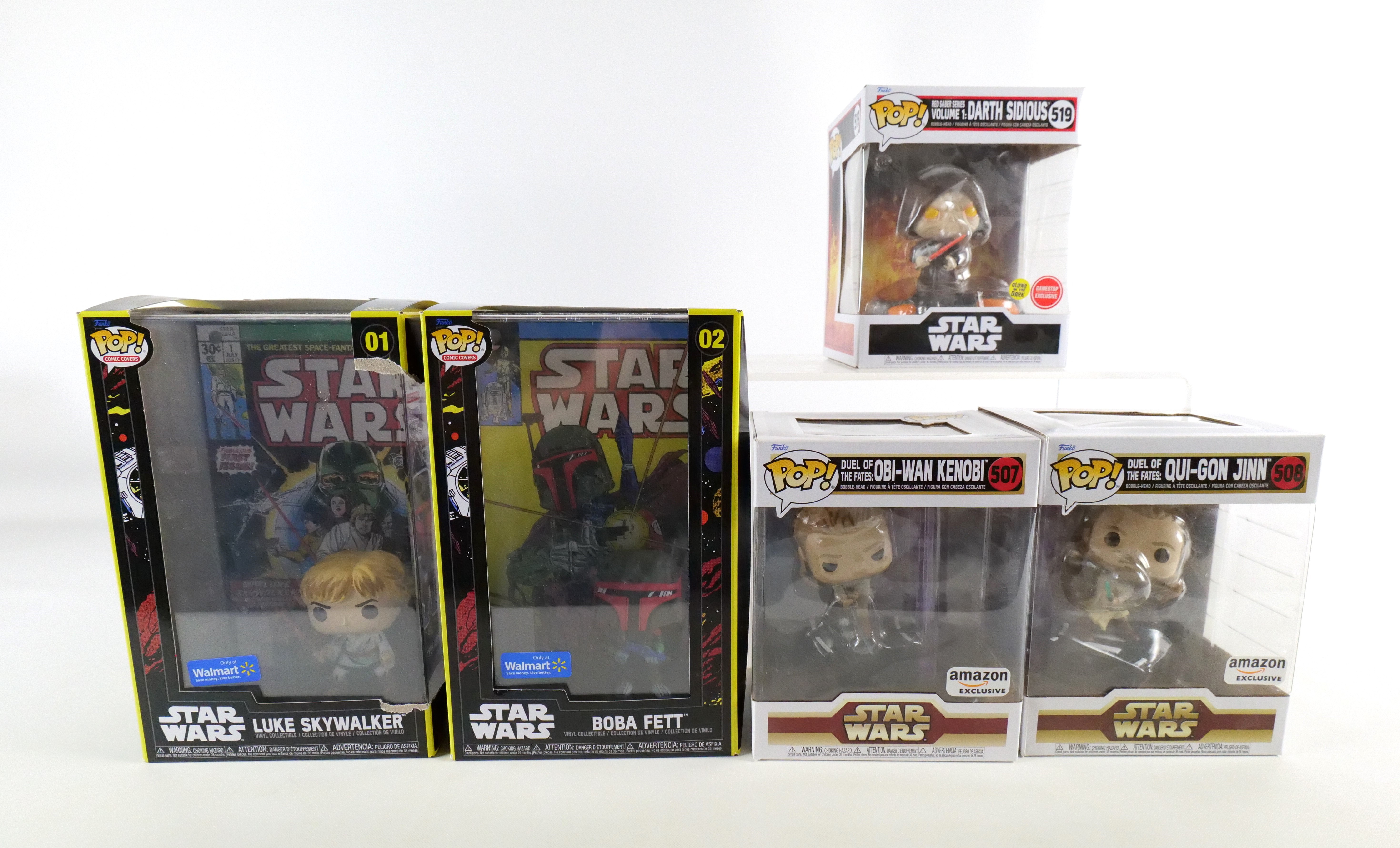 Lot of 5 Funko Star Wars Collectibles. Including Comic Covers: Luke Skywalker #01 – Tear on box and Boba Fett #02, Duel of the Fates: Obi-Wan Kenobi #507 Amazon Exclusive, Qui-Gon Jinn #508 Amazon Exclusive, and Red Saber Series Vol. 1: Darth Sidious #519 GameStop Exclusive Glow in the Dark. All pops are in new condition and come in the original boxes. The boxes may have slight wear/slight creasing/dings from storage. All invoices must be paid within 24 hours of the sale. We offer multiple shipping options please read the shipping terms to understand your options. We also offer Pick-Ups Friday, Saturday, and Monday immediately following the sale. BY APPOINTMENT ONLY.