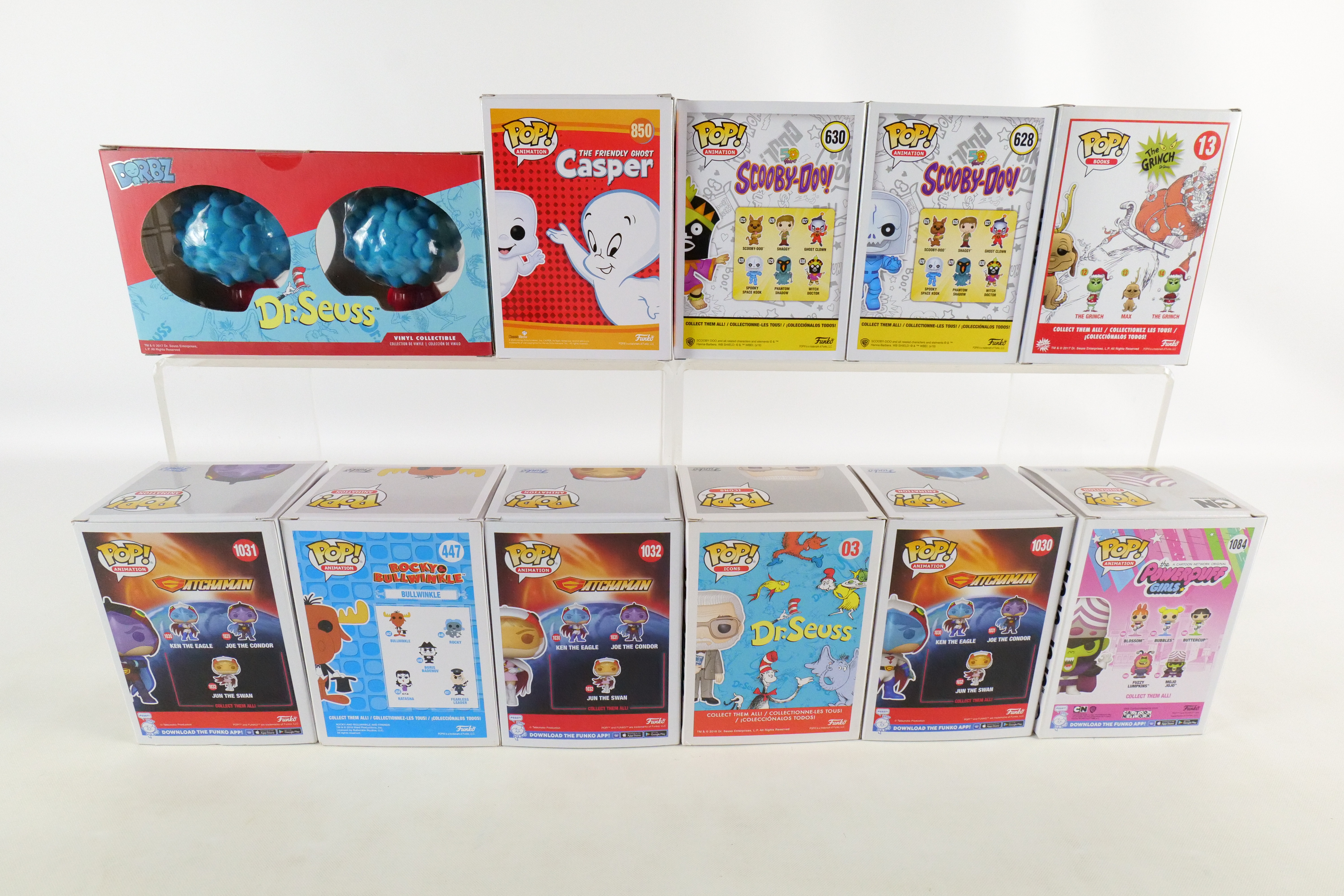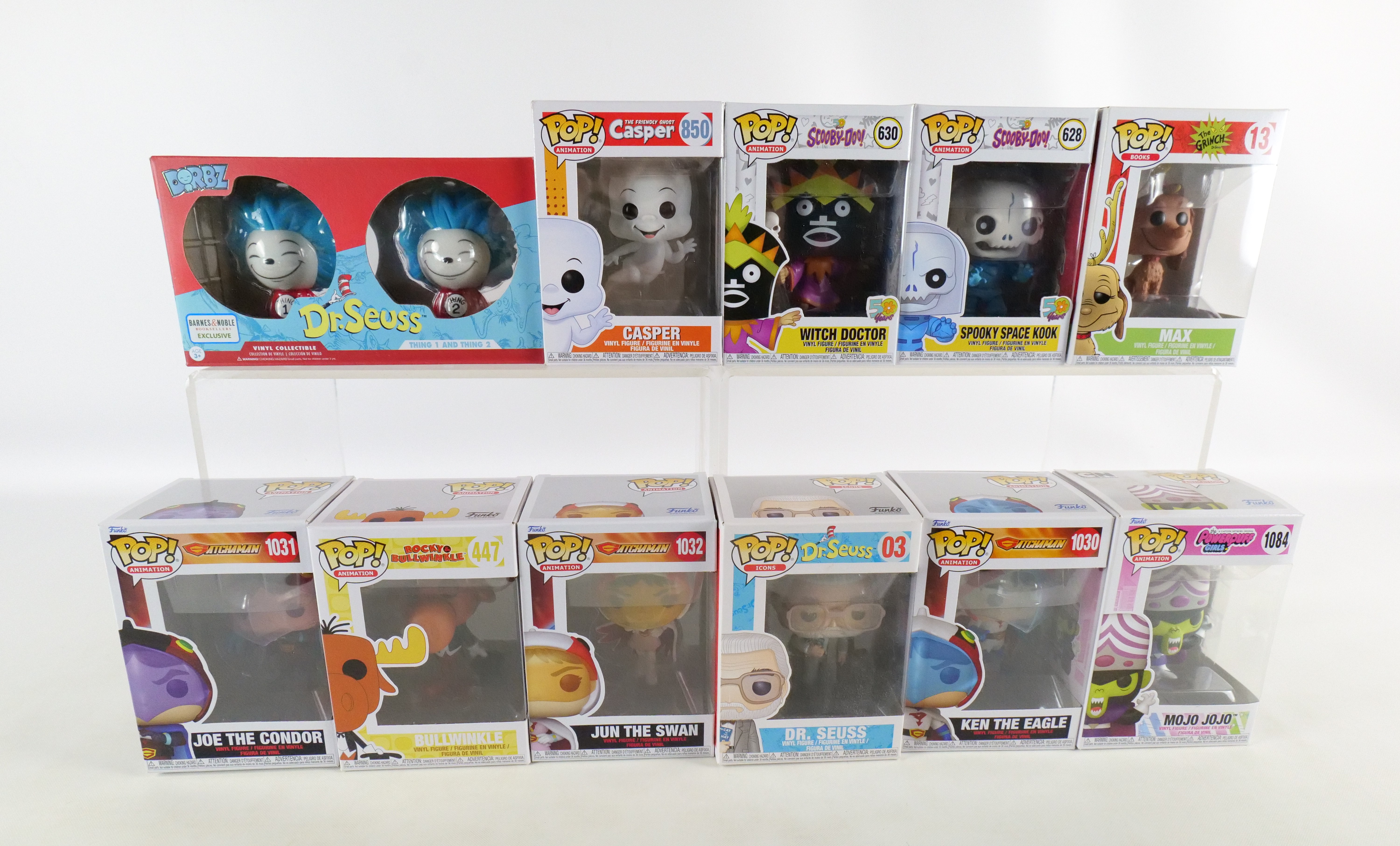 Lot of Funko Mixed Collectibles. Including Gatchaman: Ken the Eagle #1030, Joe the Connor #1031 and Jun the Swan #1032, Powerpuff Girls: Mojo Jojo #1084, Rocky and Bullwinkle: Bullwinkle #447, Casper #850, Scooby Doo: Spooky Space Kook #628, and Witch Doctor #630, Dr. Seuss #03, The Grinch: Max #13 and Dorbz: Dr. Seuss Thing 1 and Thing 2. All pops are in new condition and come in the original boxes. The boxes may have slight wear/slight creasing/dings from storage. All invoices must be paid within 24 hours of the sale. We offer multiple shipping options please read the shipping terms to understand your options. We also offer Pick-Ups Friday, Saturday, and Monday immediately following the sale. BY APPOINTMENT ONLY.