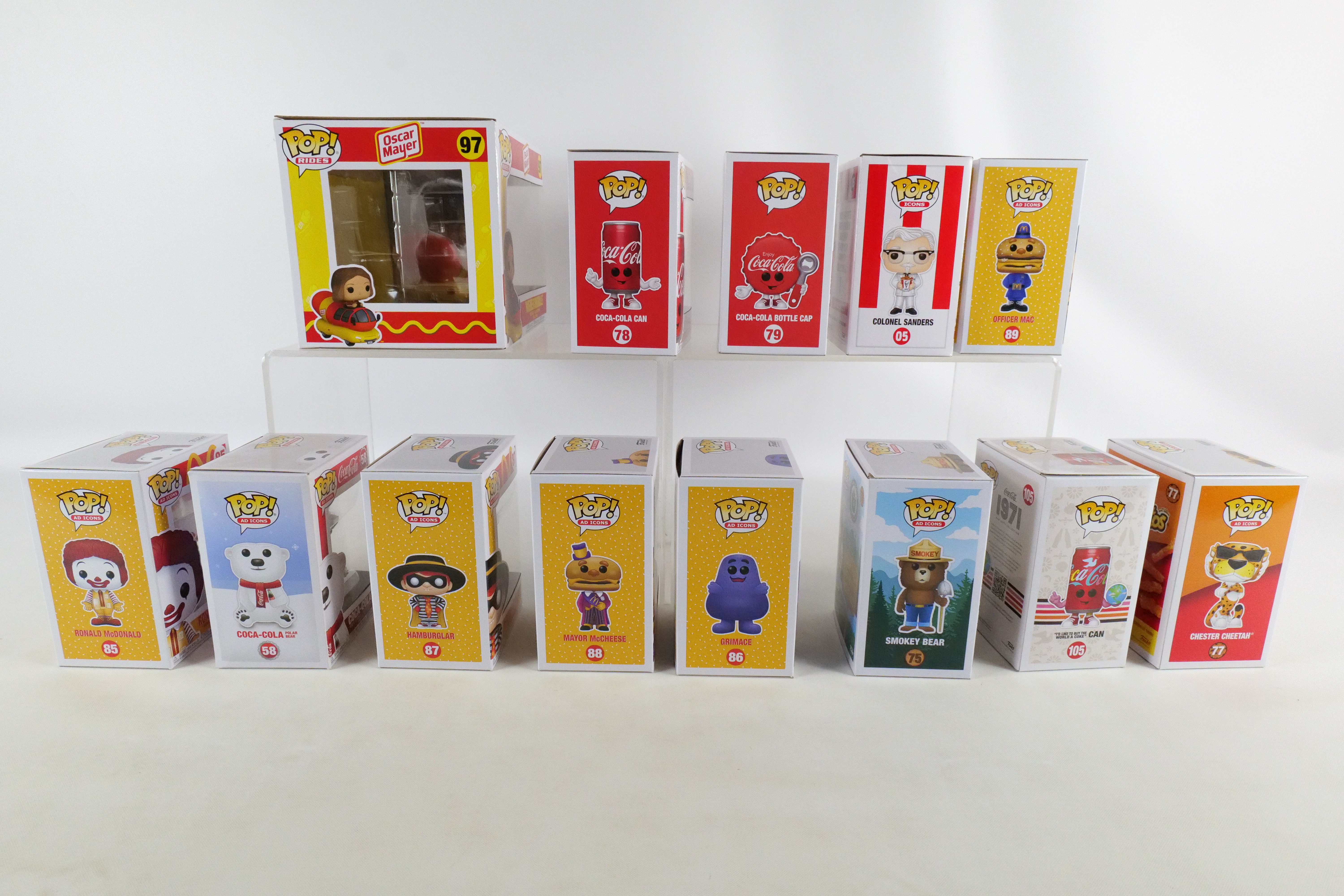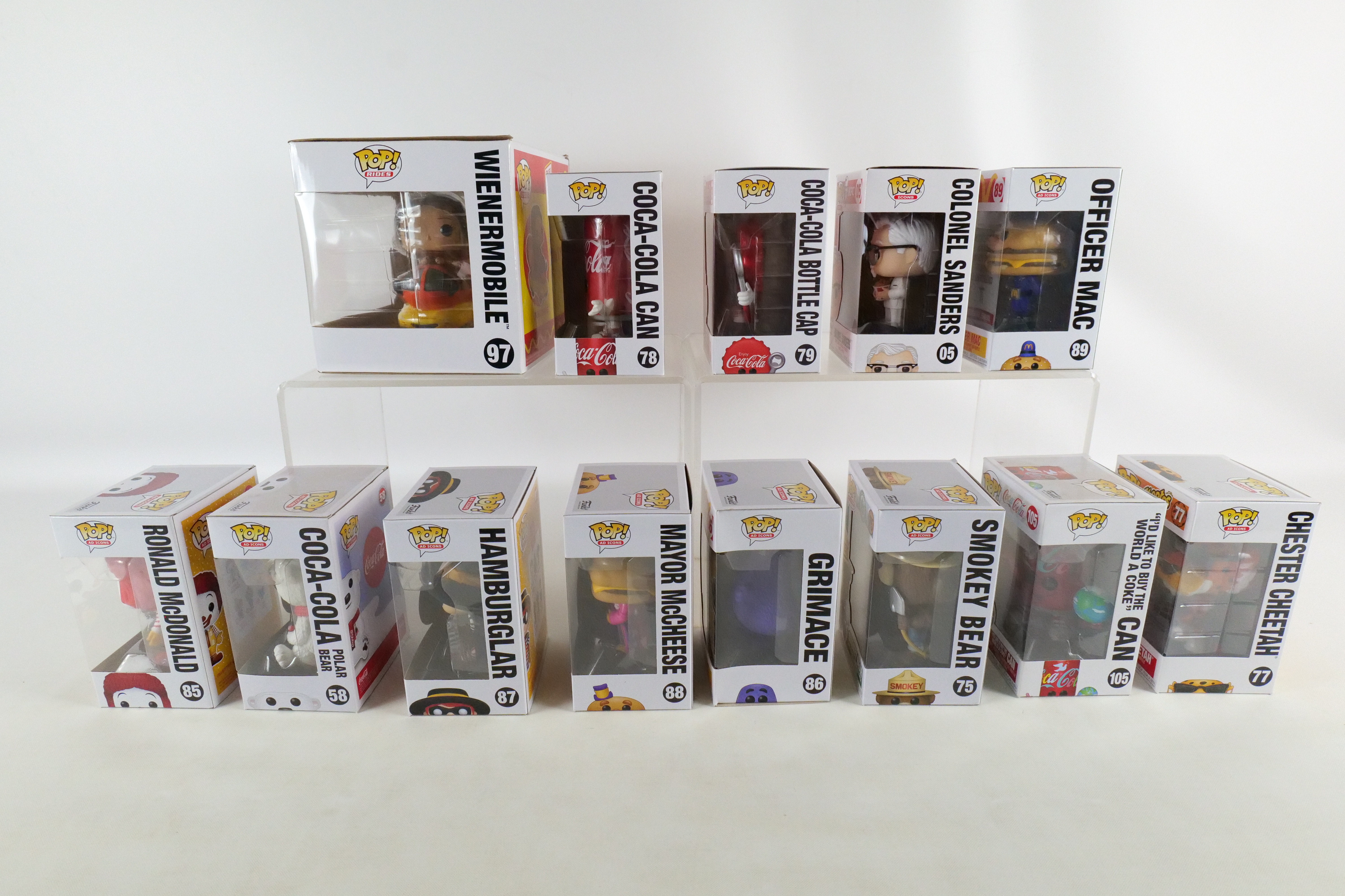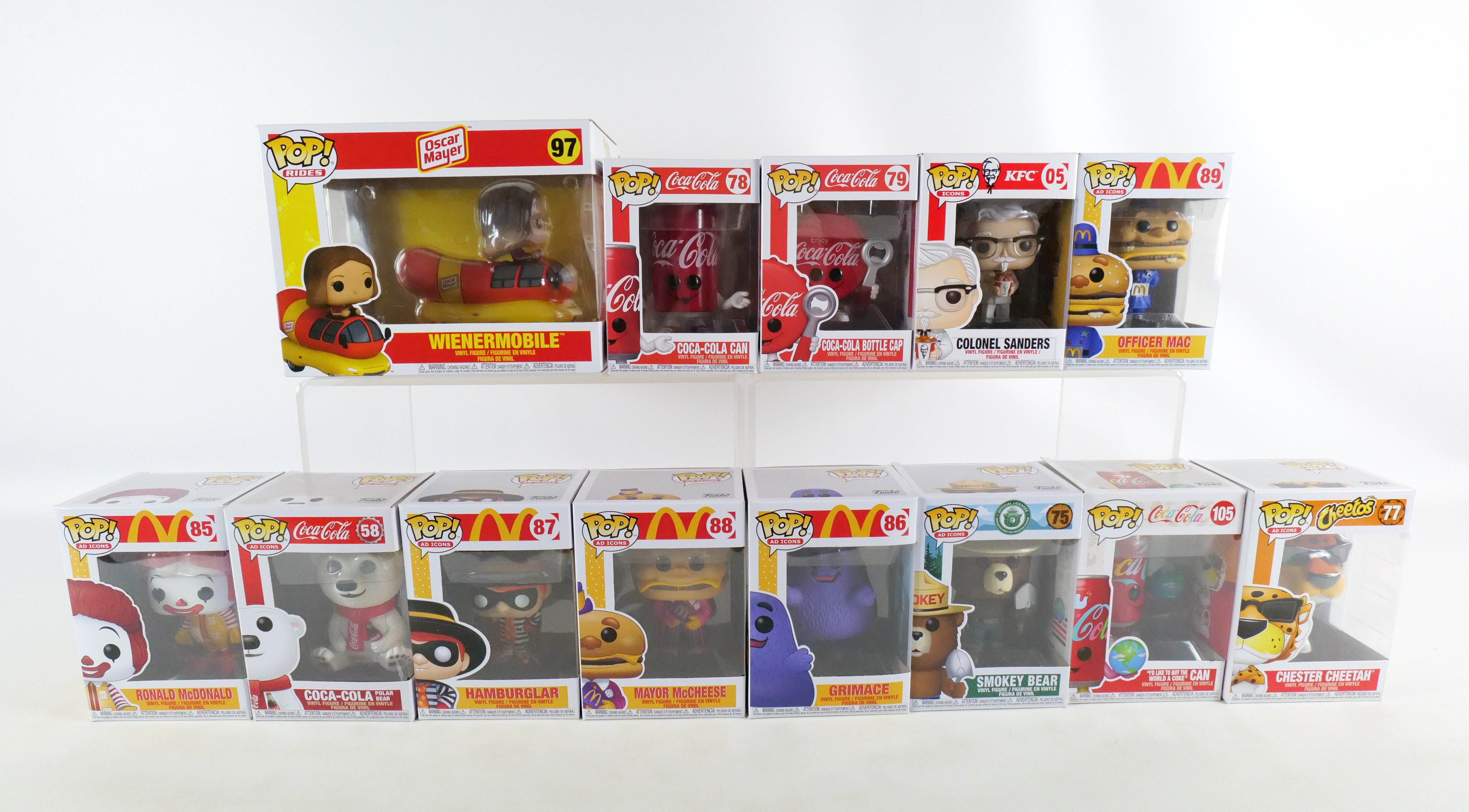 Lot of 13 Funko Ad Icons Pops. Including KFC: Colonel Sanders #05, Smokey Boy #75, Chester Cheetah #77, Coca Cola Polar Bear #58, Coca Cola Can #78, Coca Cola Bottle Cap #79, I’d Like to Buy the World a Coke Can #105, McDonald’s: Ronald McDonald #85, Grimace #86, Hamburglar #87, Mayor McCheese #88, Officer Mac #89 and Oscar Meyer: Weinermobile #97.All pops are in new condition and come in the original boxes. The boxes may have slight wear/slight creasing/dings from storage. All invoices must be paid within 24 hours of the sale. We offer multiple shipping options please read the shipping terms to understand your options. We also offer Pick-Ups Friday, Saturday, and Monday immediately following the sale. BY APPOINTMENT ONLY.