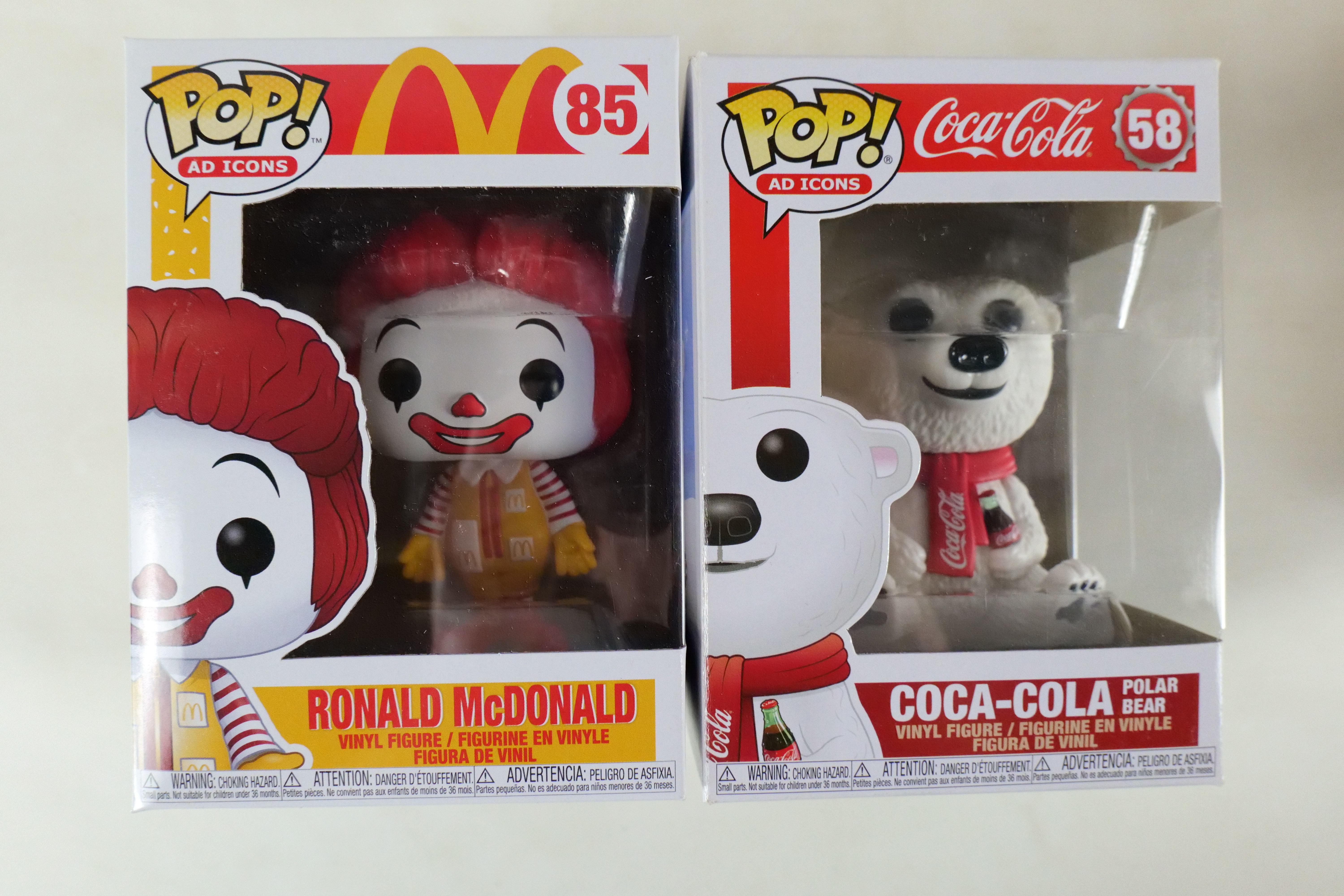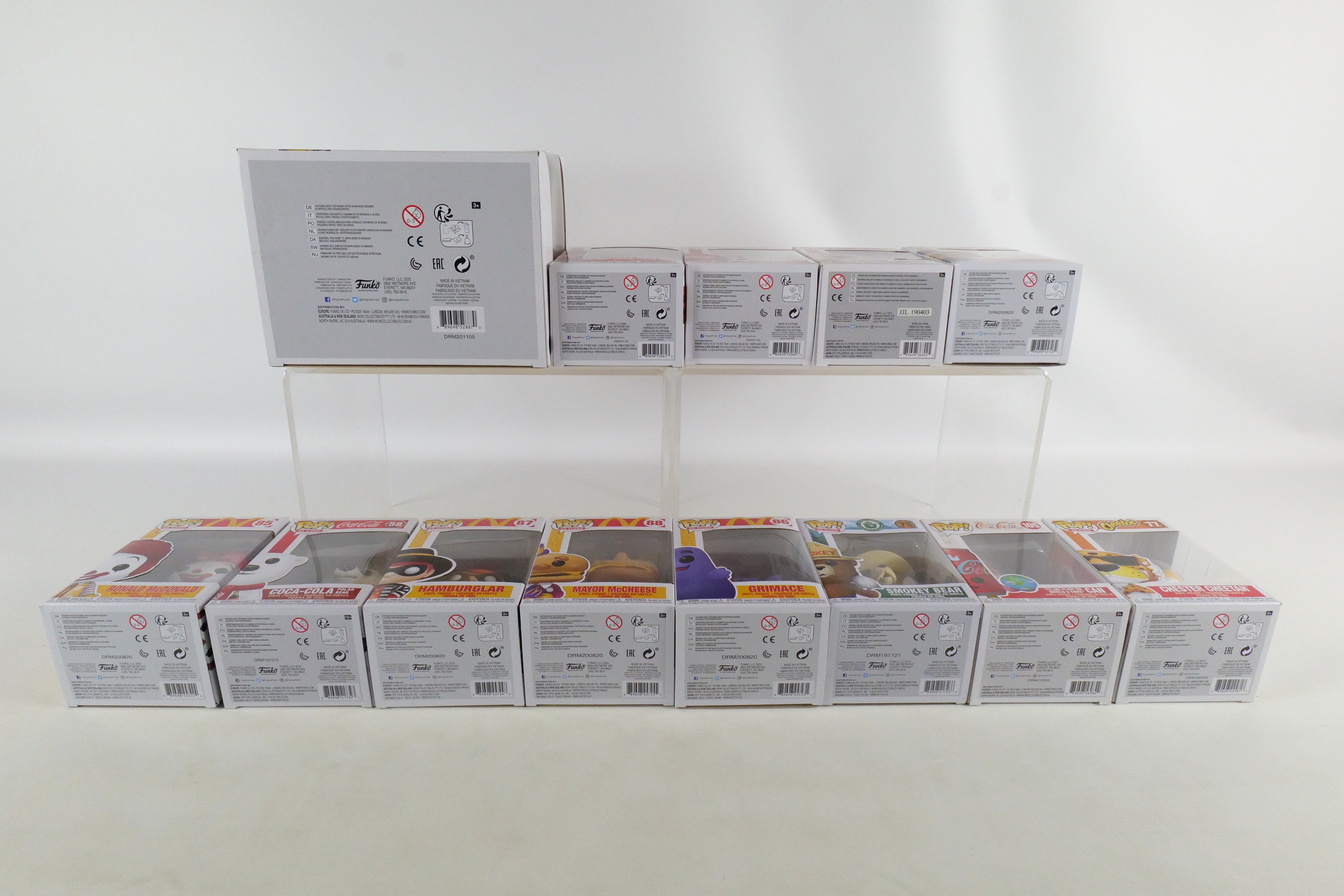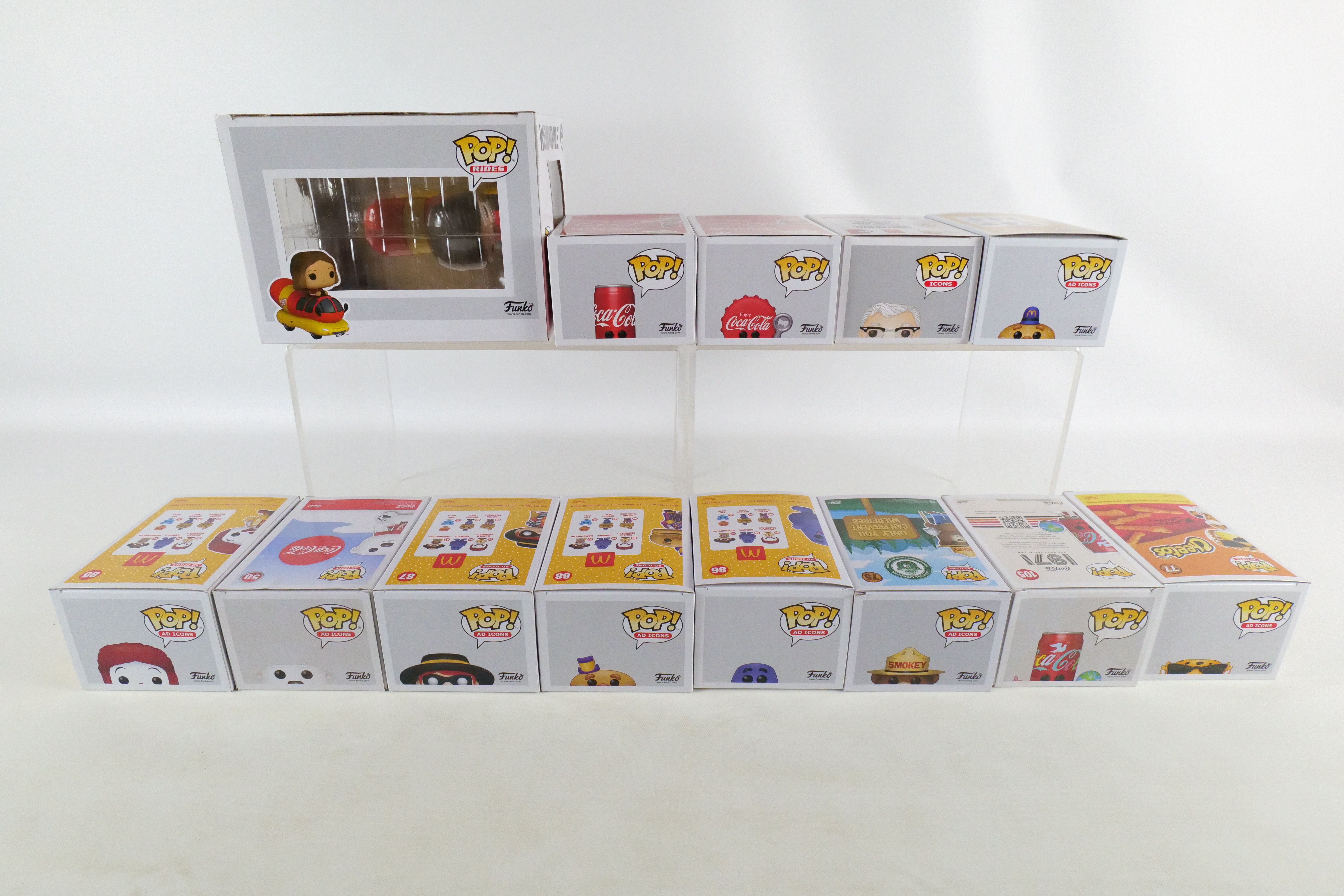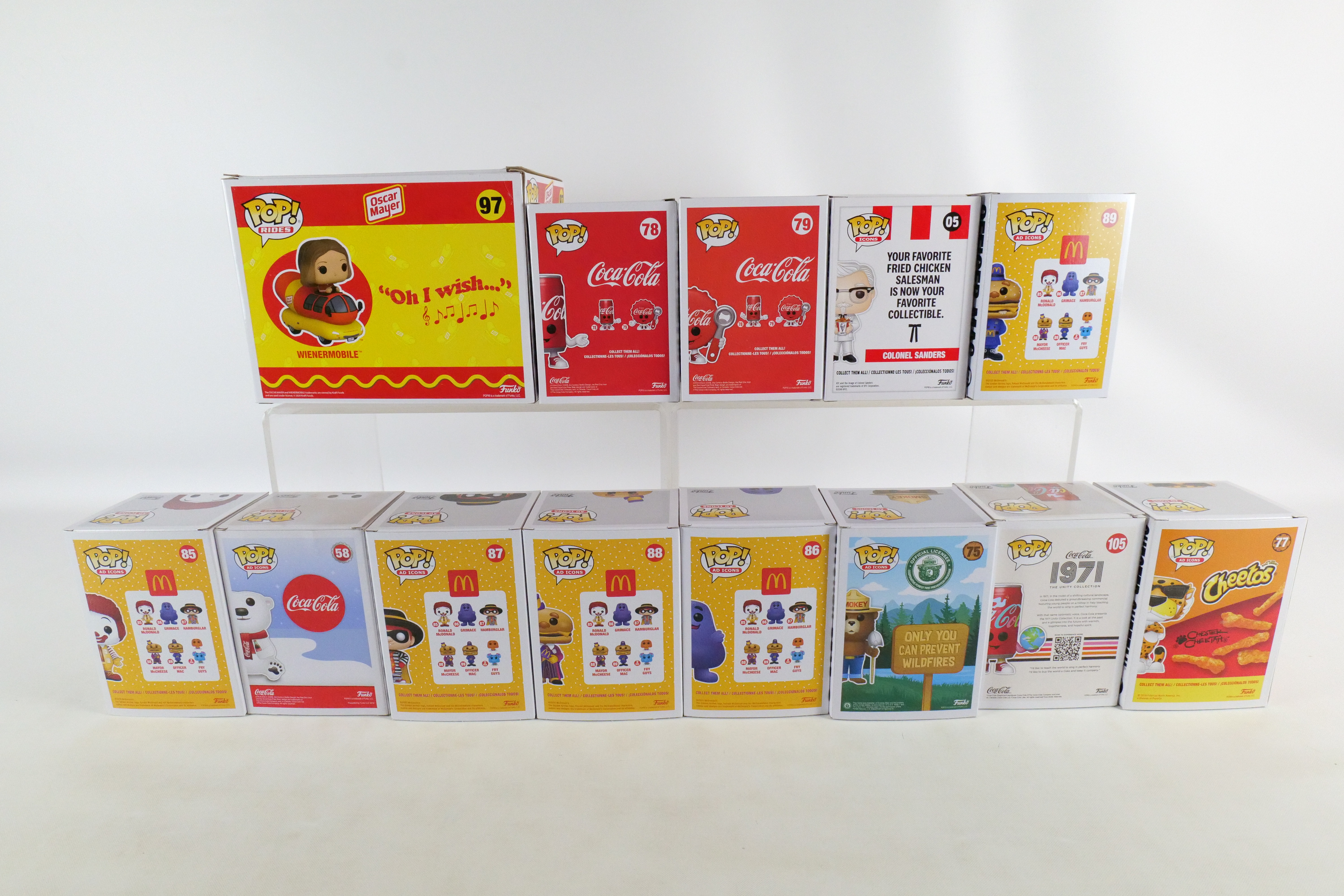 Lot of 13 Funko Ad Icons Pops. Including KFC: Colonel Sanders #05, Smokey Boy #75, Chester Cheetah #77, Coca Cola Polar Bear #58, Coca Cola Can #78, Coca Cola Bottle Cap #79, I’d Like to Buy the World a Coke Can #105, McDonald’s: Ronald McDonald #85, Grimace #86, Hamburglar #87, Mayor McCheese #88, Officer Mac #89 and Oscar Meyer: Weinermobile #97.All pops are in new condition and come in the original boxes. The boxes may have slight wear/slight creasing/dings from storage. All invoices must be paid within 24 hours of the sale. We offer multiple shipping options please read the shipping terms to understand your options. We also offer Pick-Ups Friday, Saturday, and Monday immediately following the sale. BY APPOINTMENT ONLY.