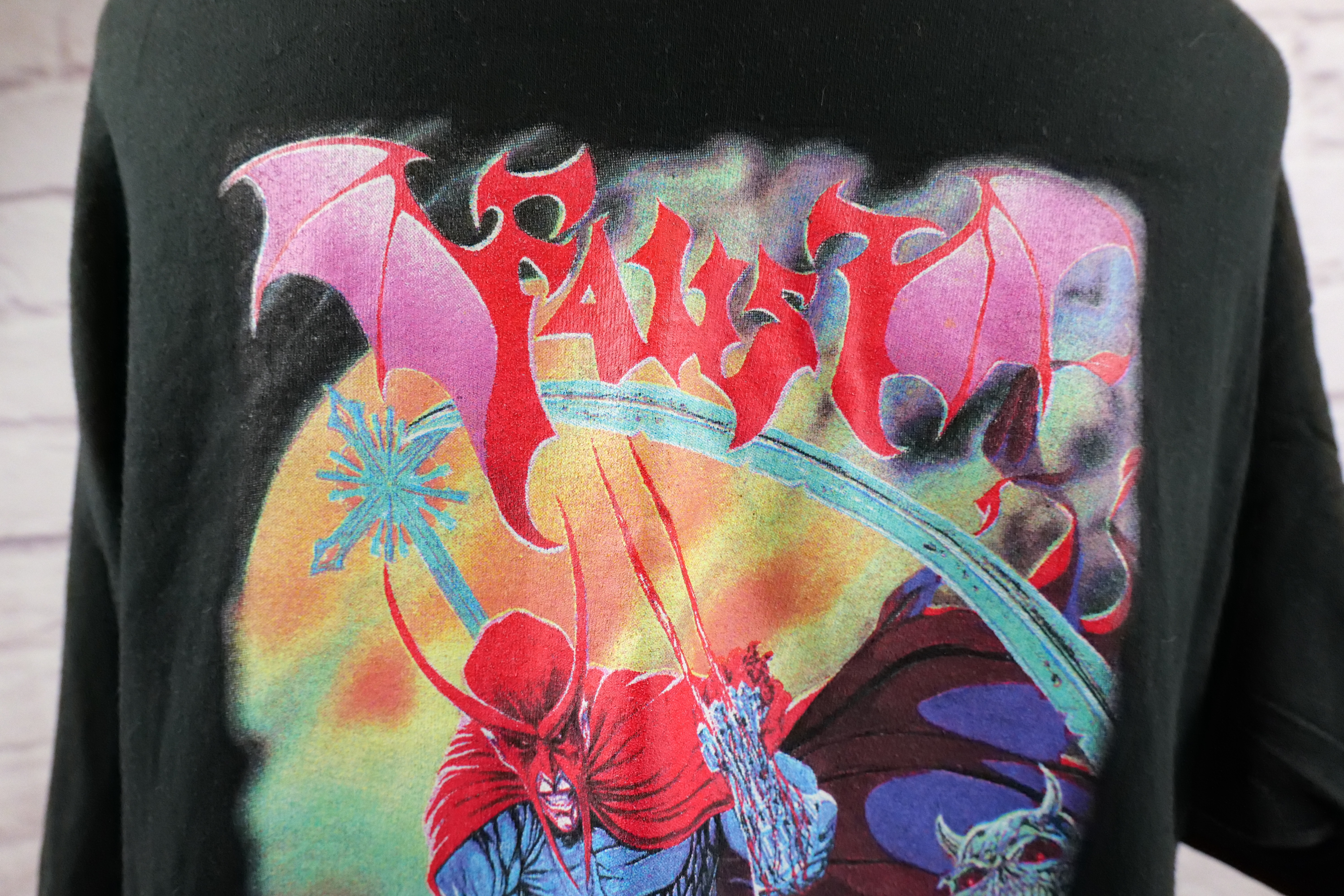 Vintage Faust T-Shirt. Fruit of the Loom Tag. Size XL. Appears to be in Very Good Vintage/Possible Used Condition. All invoices must be paid within 24 hours of the sale. We offer multiple shipping options please read the shipping terms to understand your options.All invoices must be paid within 24 hours of the sale. We offer multiple shipping options please read the shipping terms to understand your options. We also offer Pick-Ups Friday, Saturday, and Monday immediately following the sale. BY APPOINTMENT ONLY.