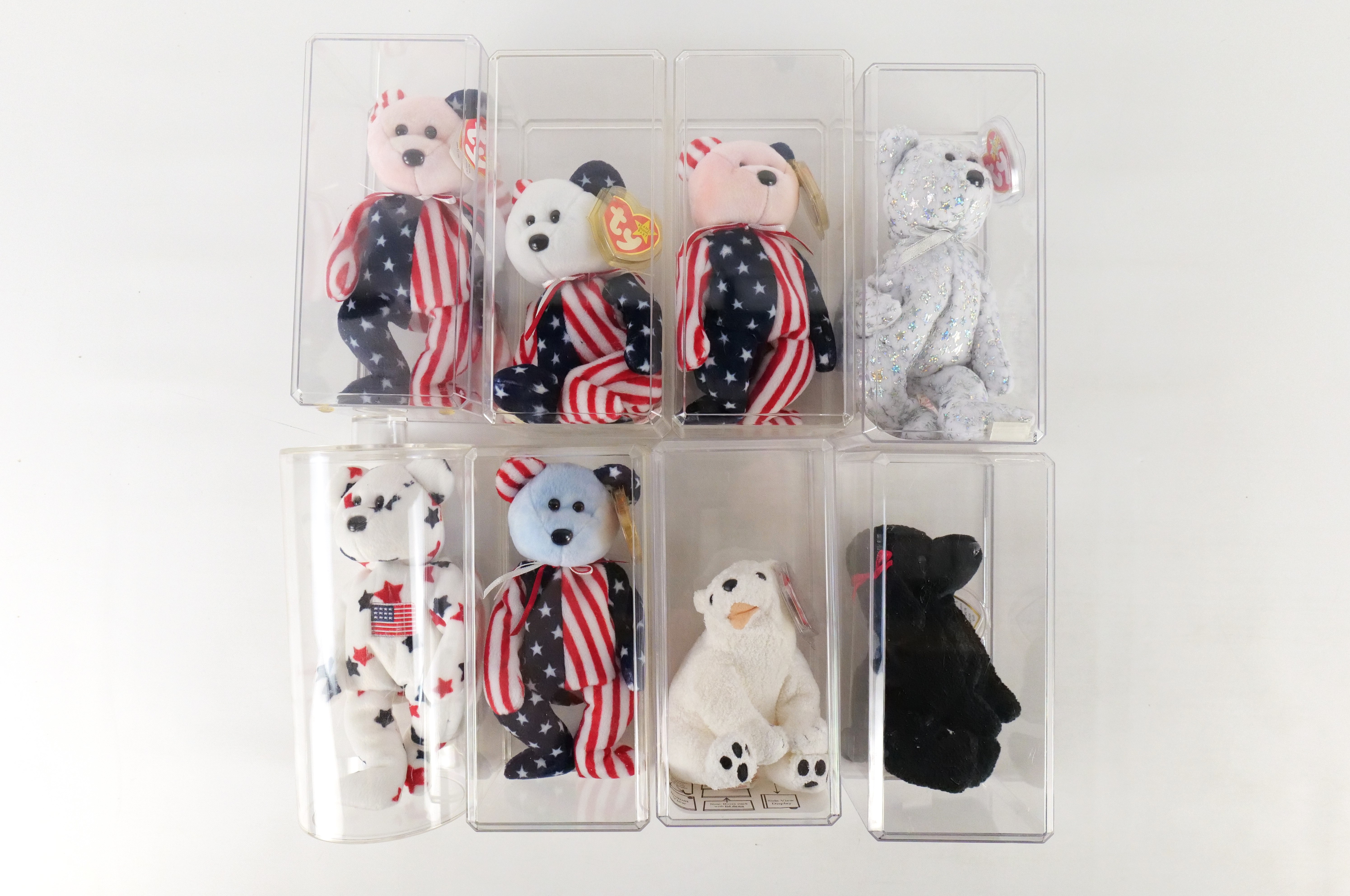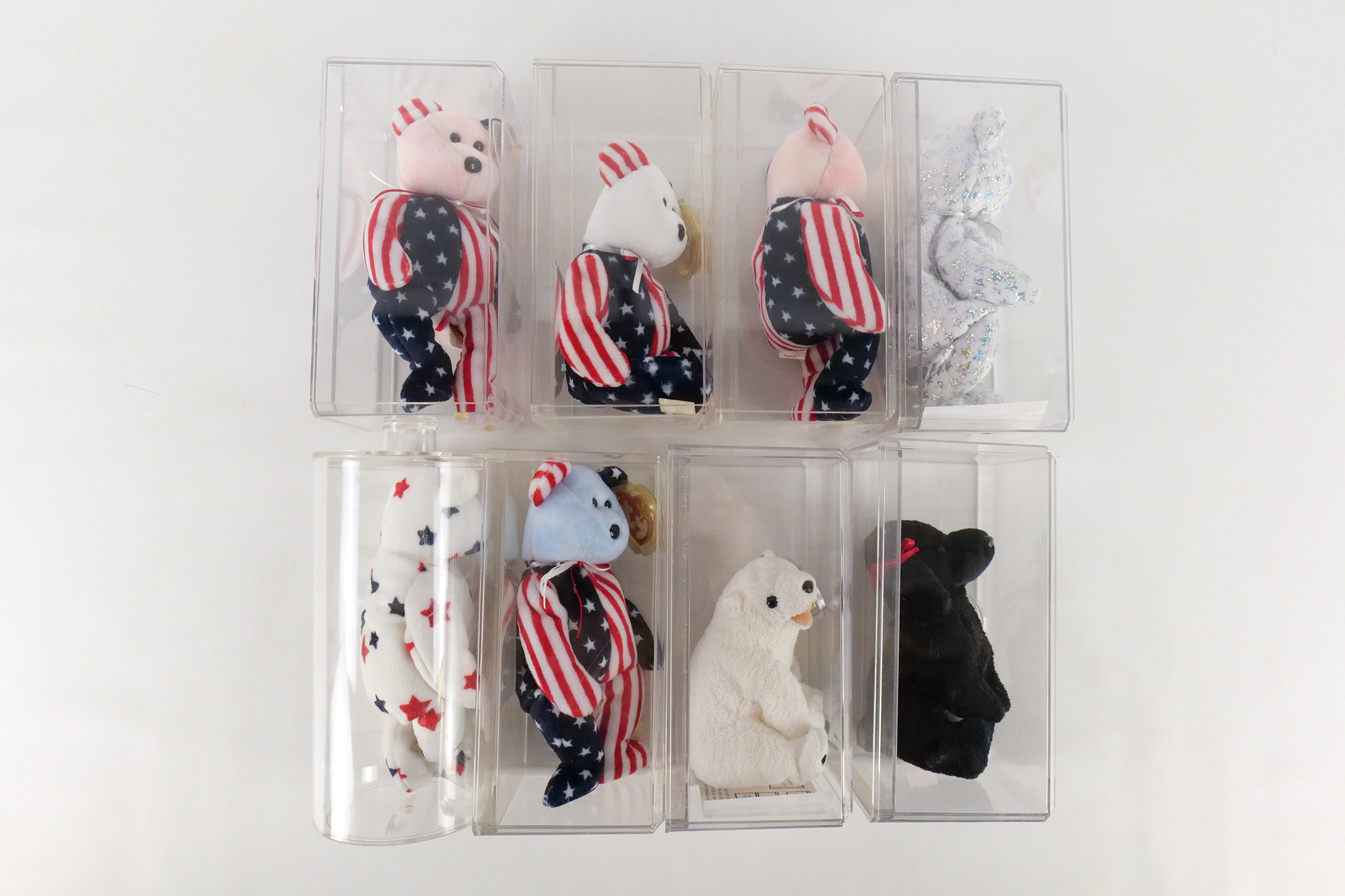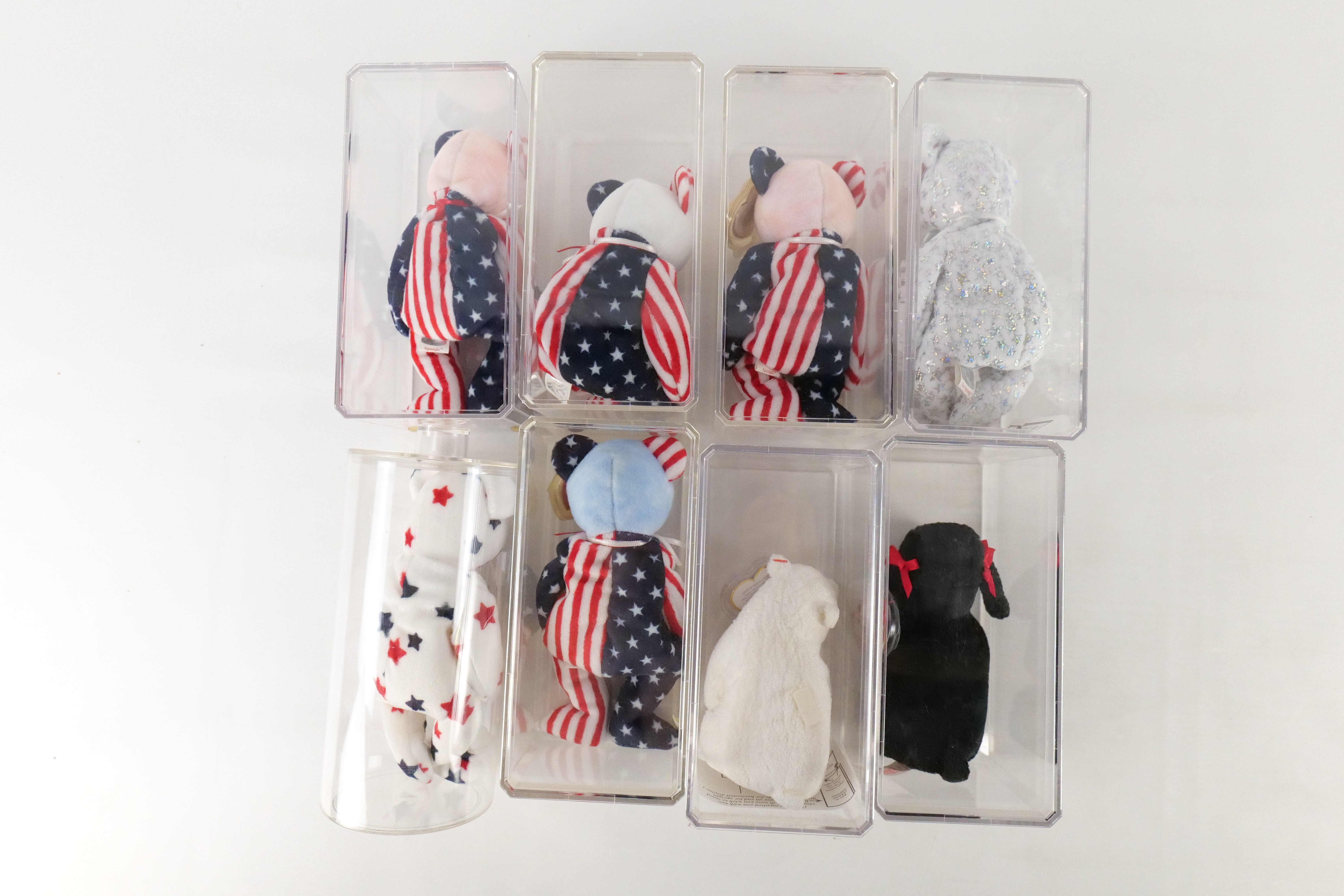 Lot of 8 Beanie Babies. Including 2x Spangle Pink Bear, Spangle White Bear, Spangle Bear Blue Face, The Beginning, Glory Bear, Aurora, and Gigi. All come with protective cases. All invoices must be paid within 24 hours of the sale. We offer multiple shipping options please read the shipping terms to understand your options. We also offer Pick-Ups Friday, Saturday, and Monday immediately following the sale. BY APPOINTMENT ONLY.