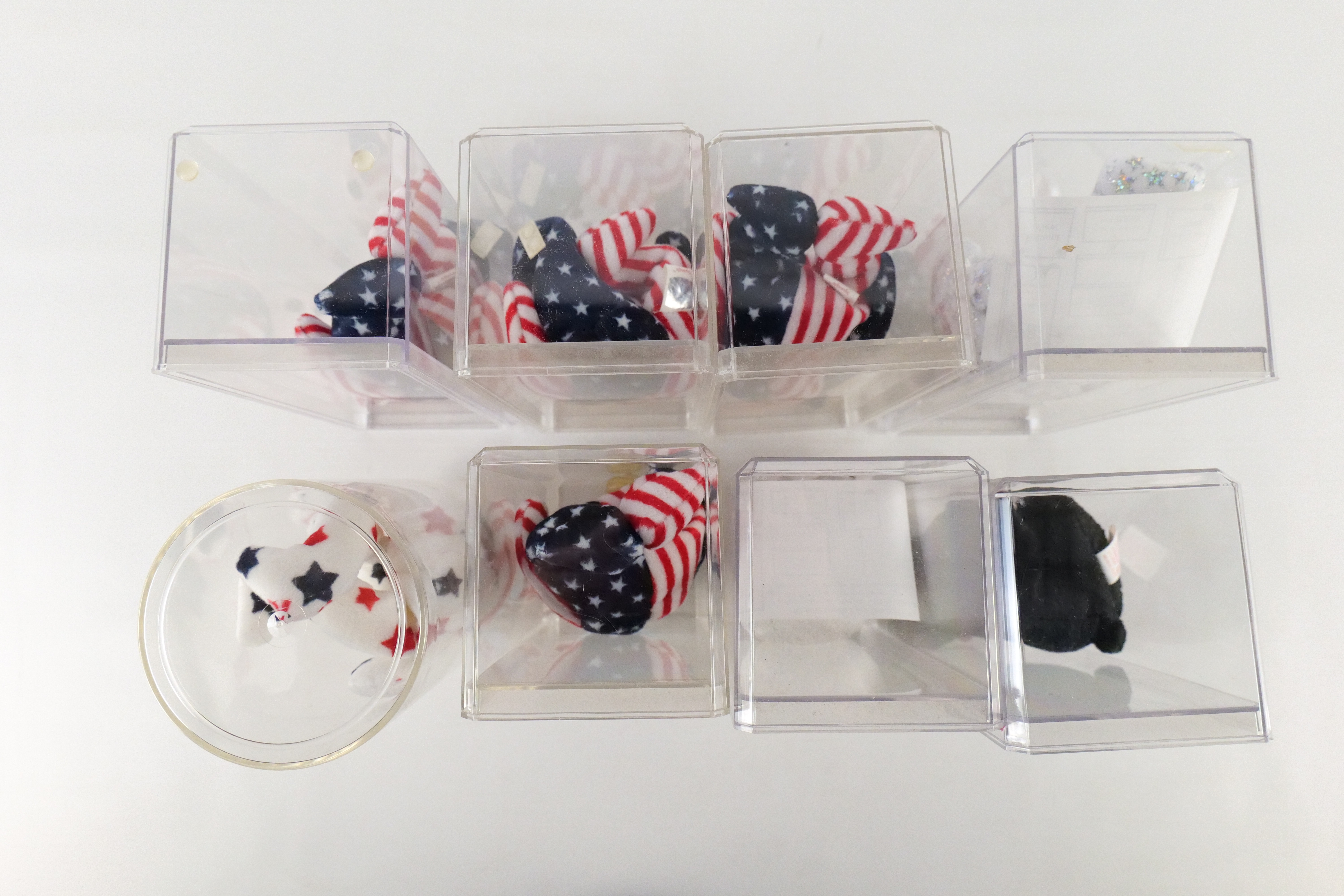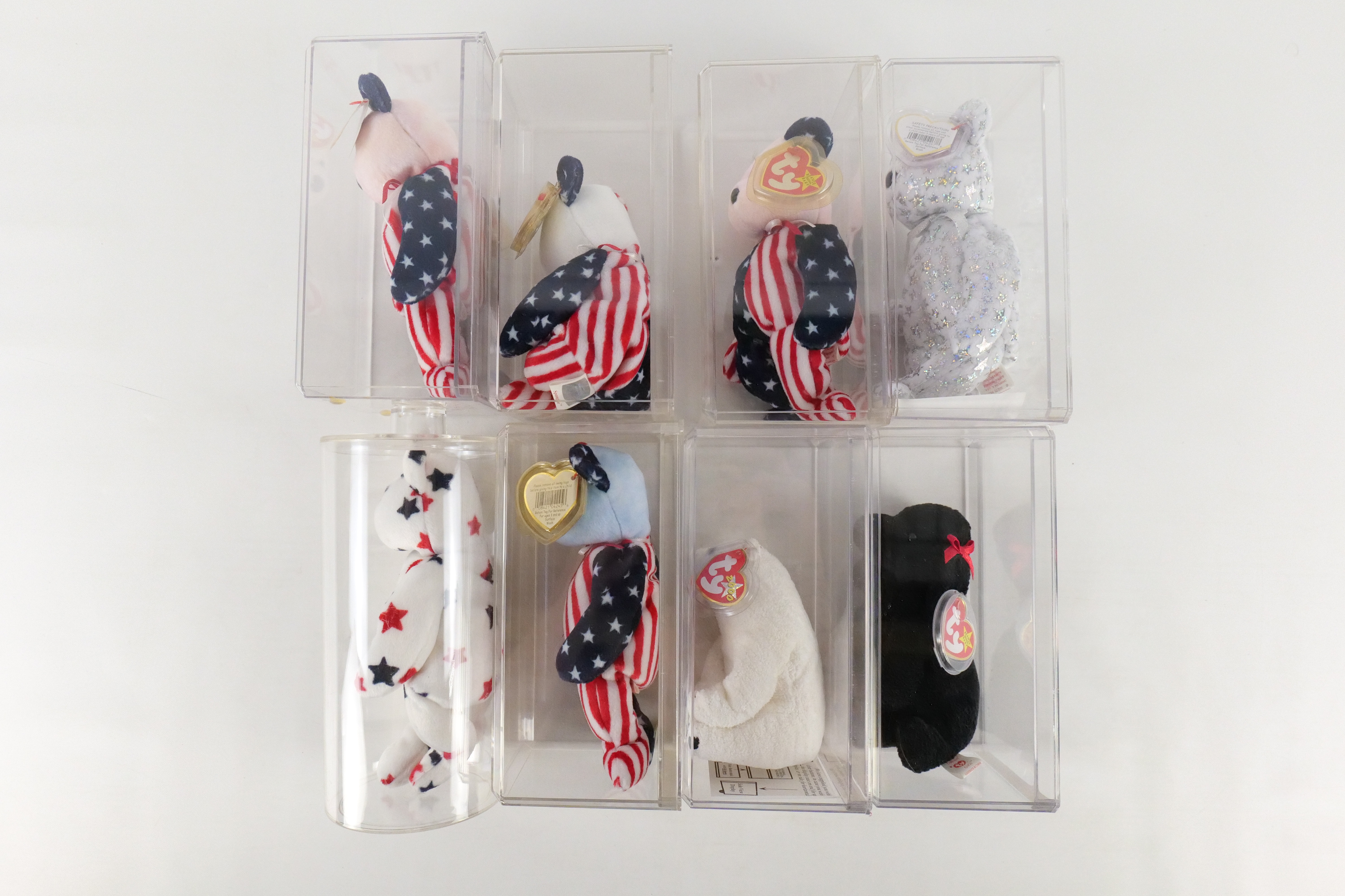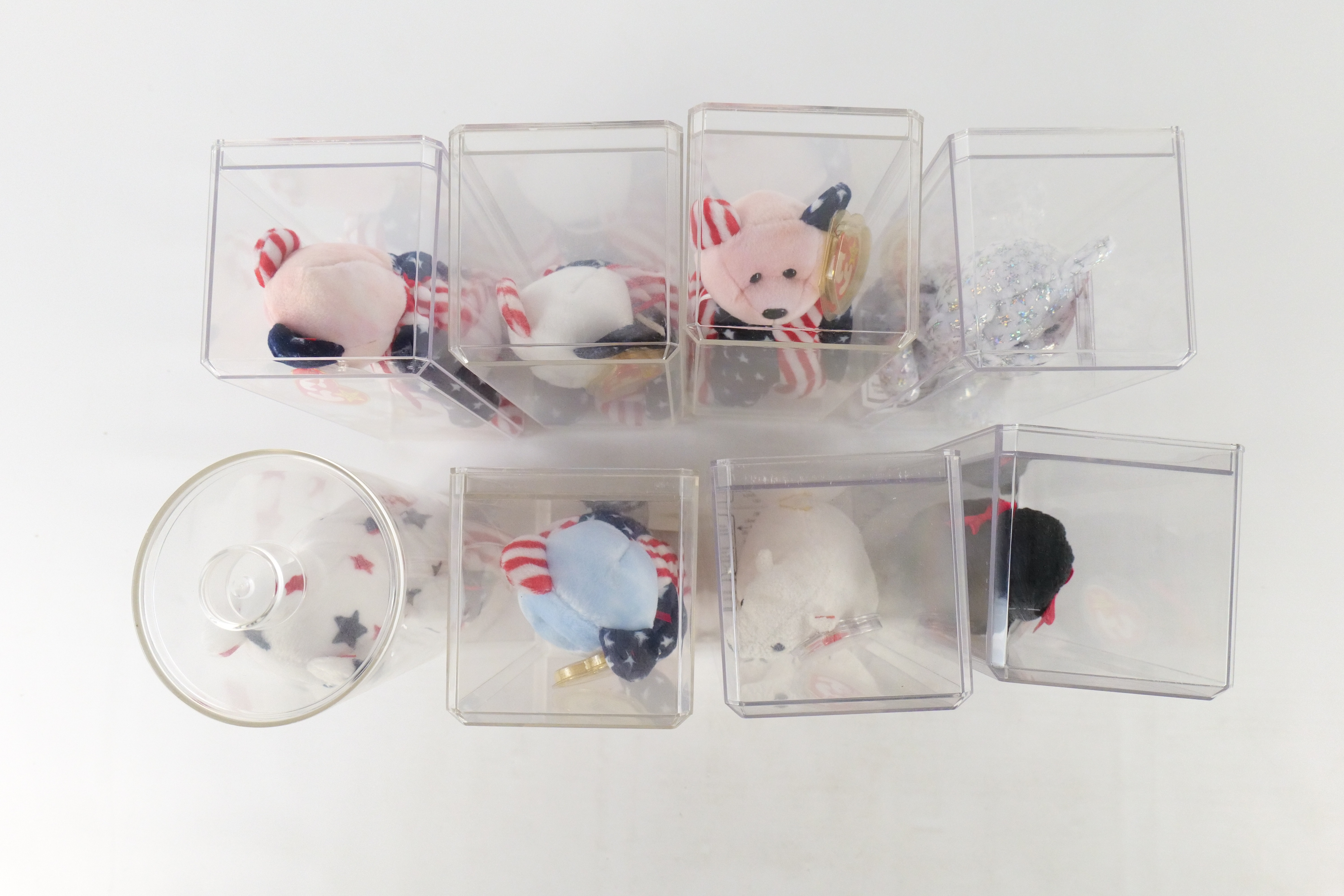 Lot of 8 Beanie Babies. Including 2x Spangle Pink Bear, Spangle White Bear, Spangle Bear Blue Face, The Beginning, Glory Bear, Aurora, and Gigi. All come with protective cases. All invoices must be paid within 24 hours of the sale. We offer multiple shipping options please read the shipping terms to understand your options. We also offer Pick-Ups Friday, Saturday, and Monday immediately following the sale. BY APPOINTMENT ONLY.