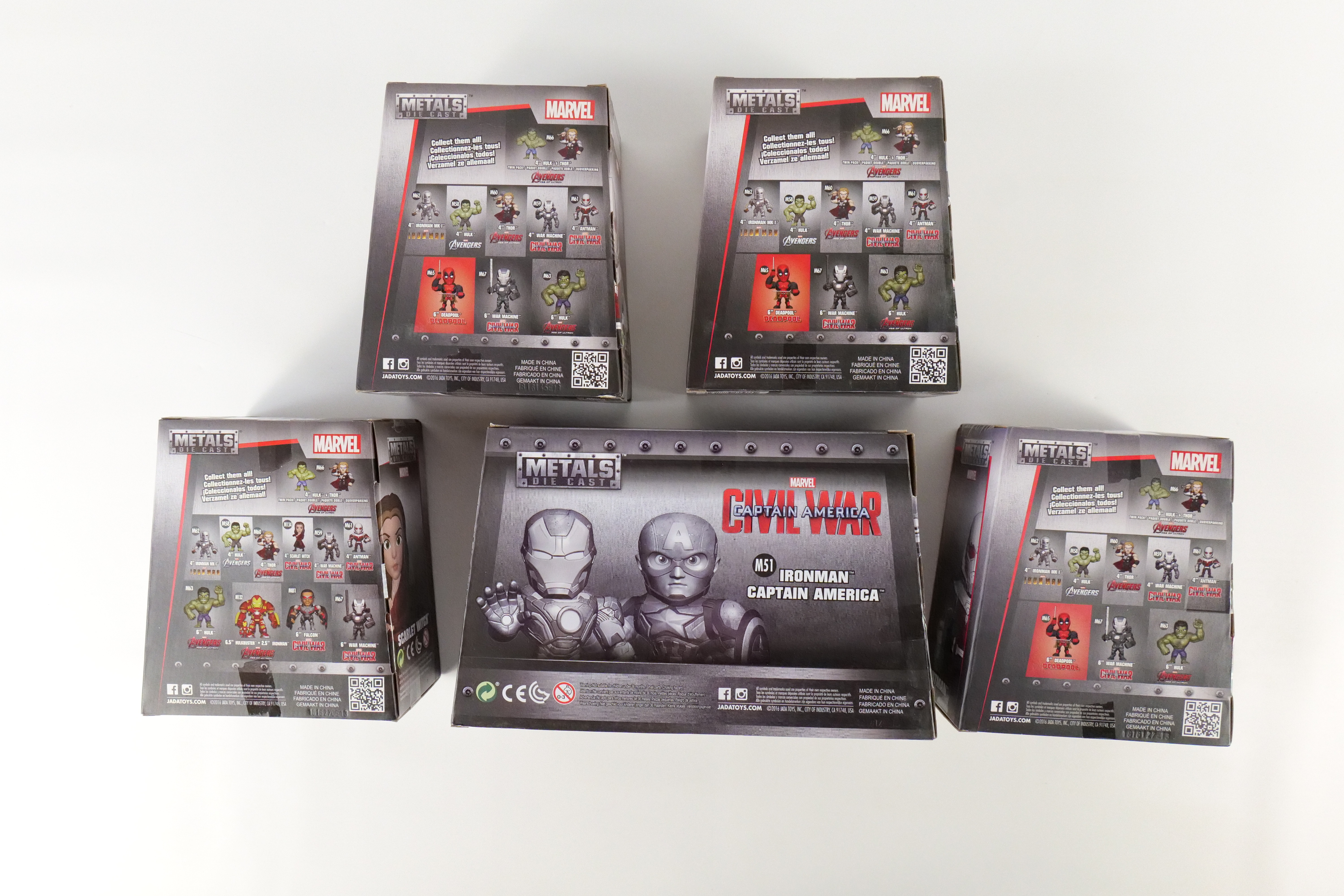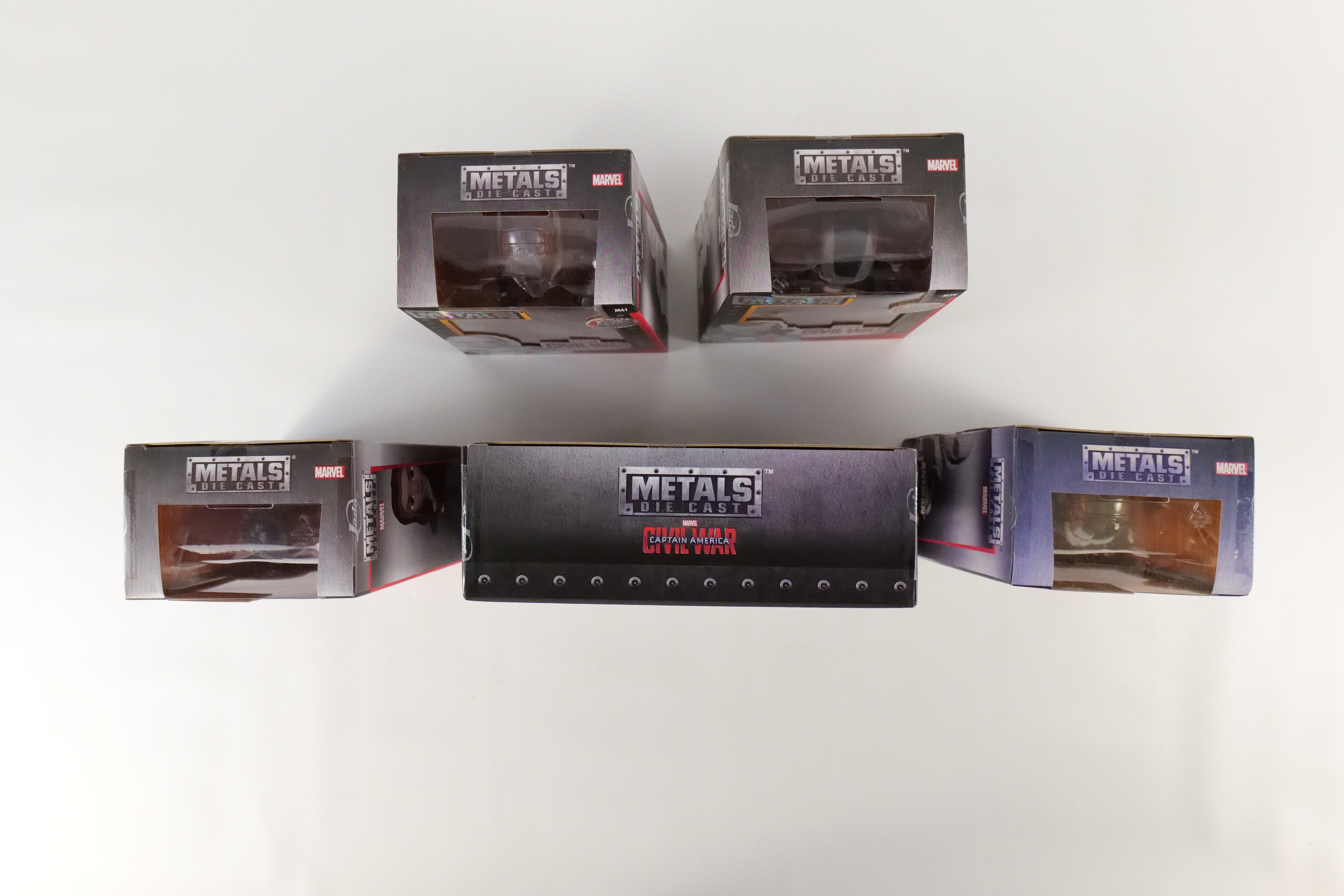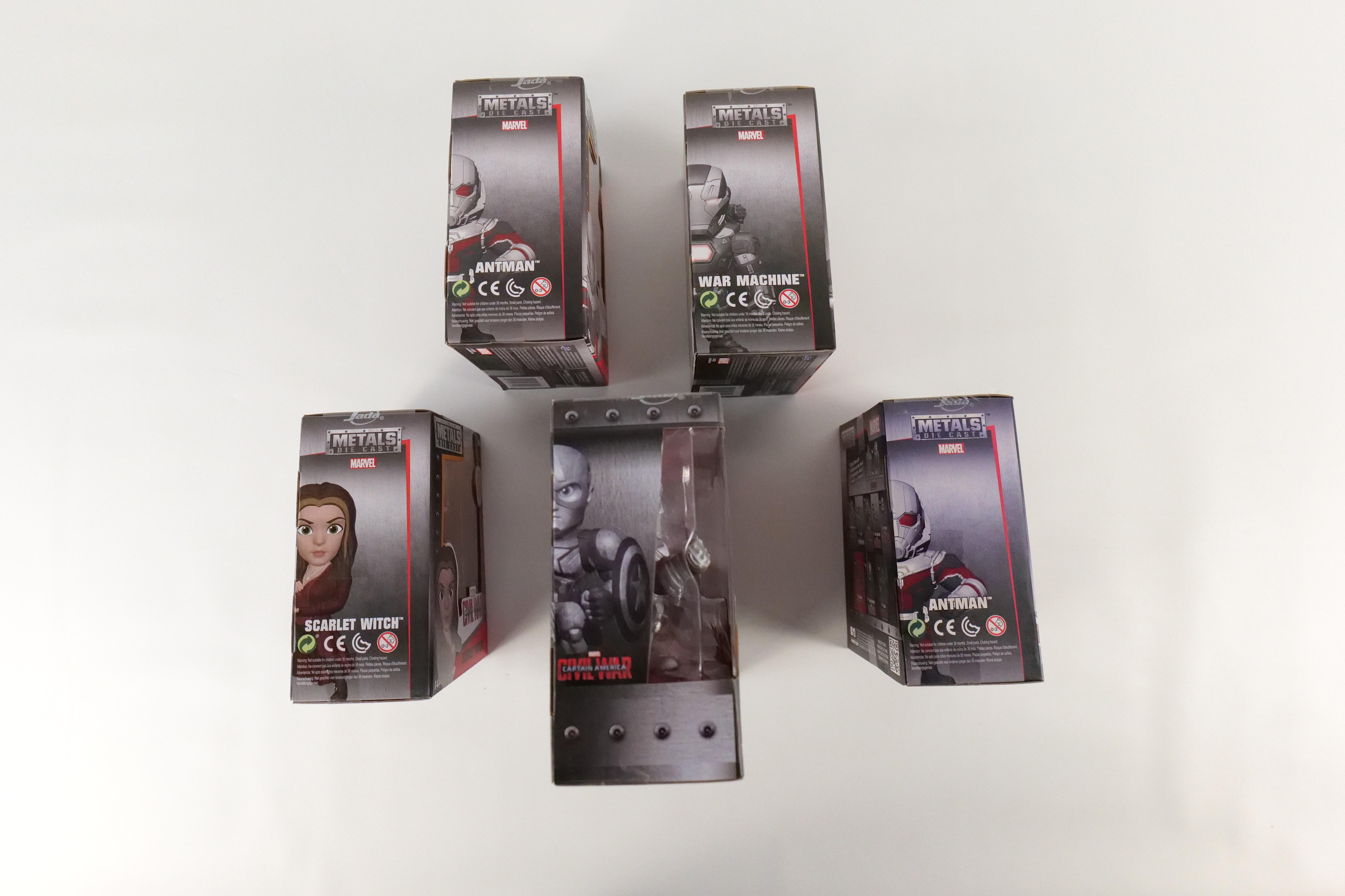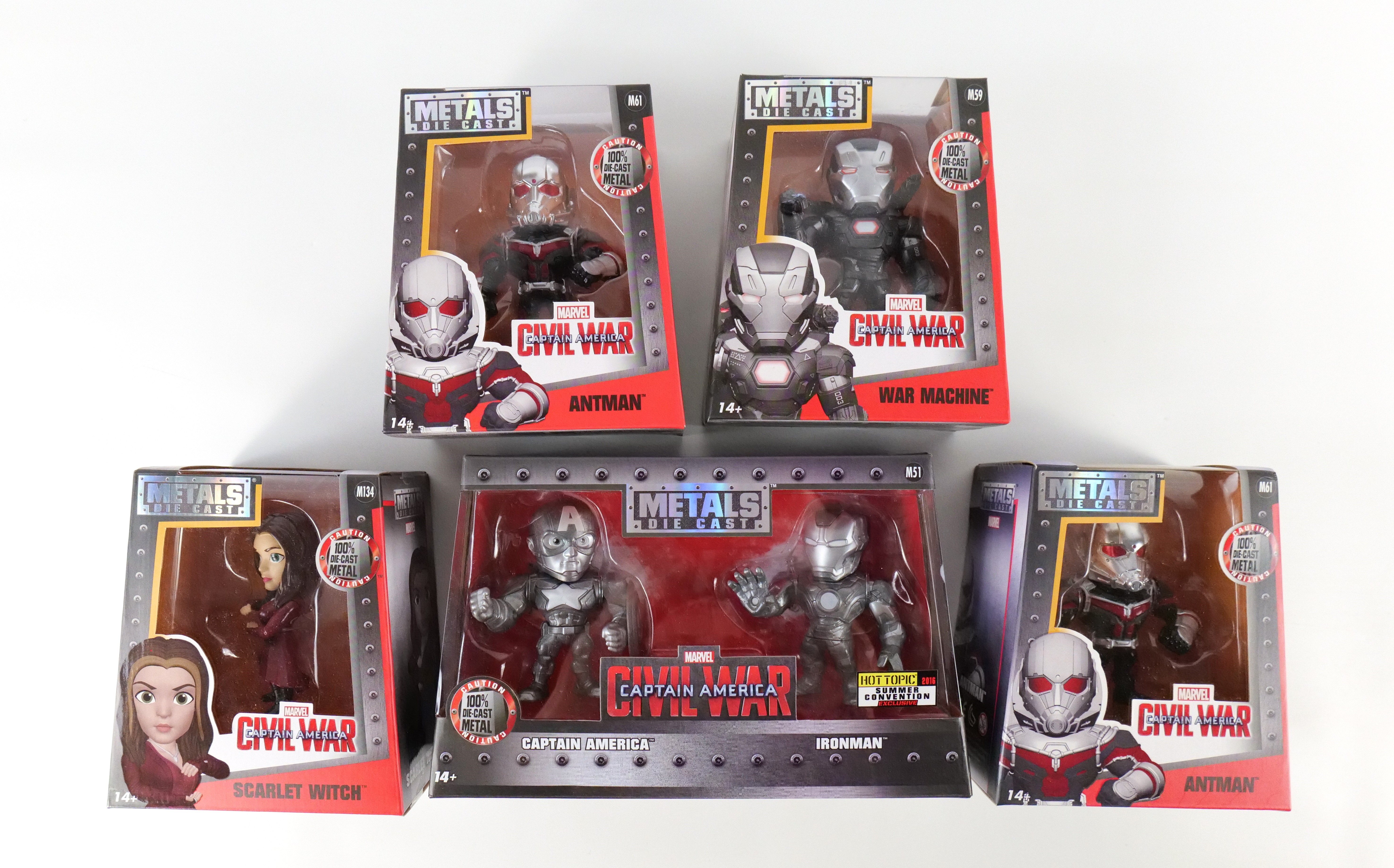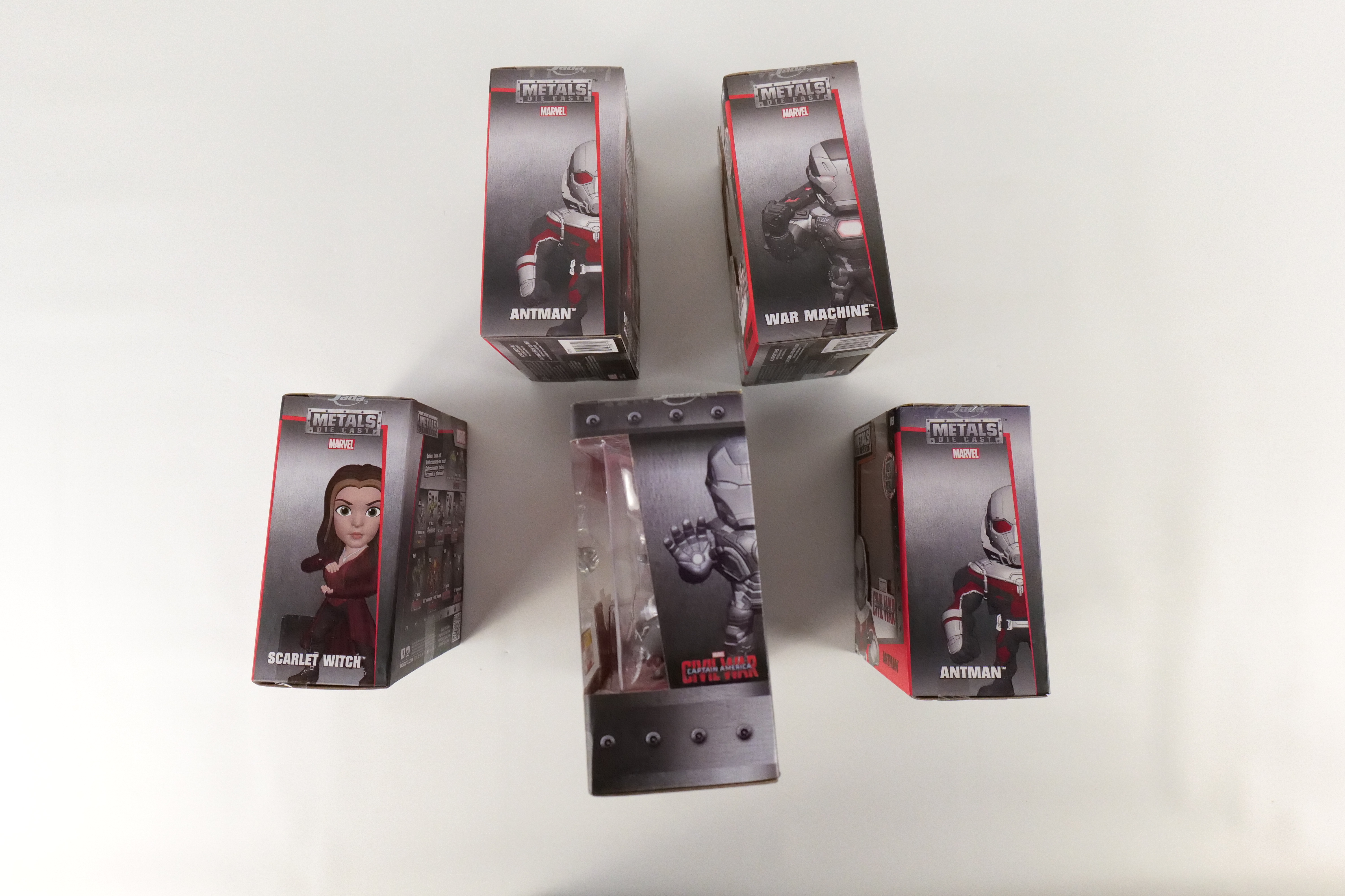Lot of 5 Marvel Captain America Civil War Jada Metals Figurines. Including Captain America/Iron Man Hot Topic Summer Convention Exclusive 2 Pack, 2 x Antman, Scarlet Witch, War Machine. All new in box. All invoices must be paid within 24 hours of the sale. We offer multiple shipping options please read the shipping terms to understand your options. We also offer Pick-Ups Friday, Saturday, and Monday immediately following the sale. BY APPOINTMENT ONLY.